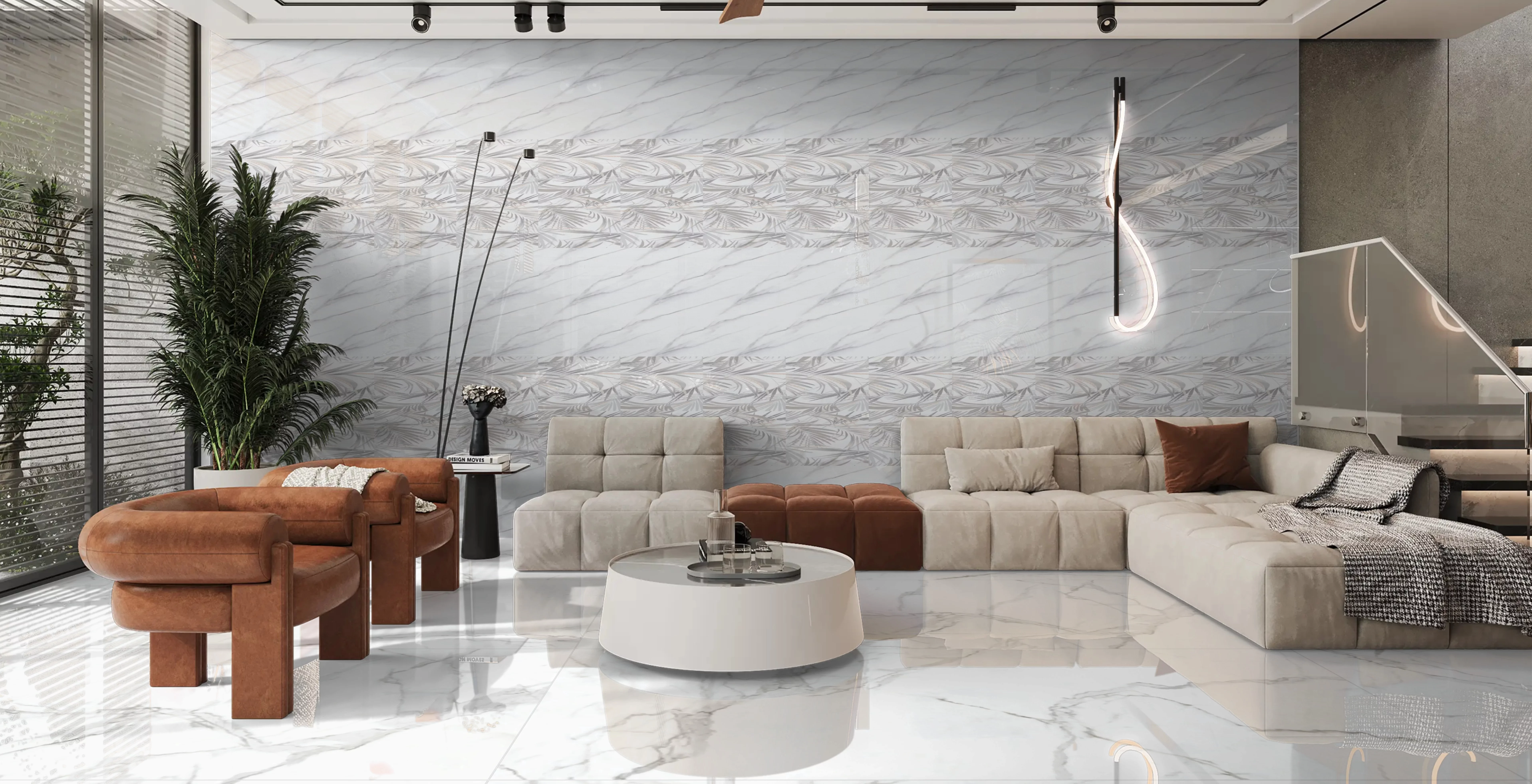 Finisajul lucios reflectă lumina într-un mod plăcut, amplificând senzația de spațiu, în timp ce marginile rectificate permit o montare continuă, cu rosturi minime.