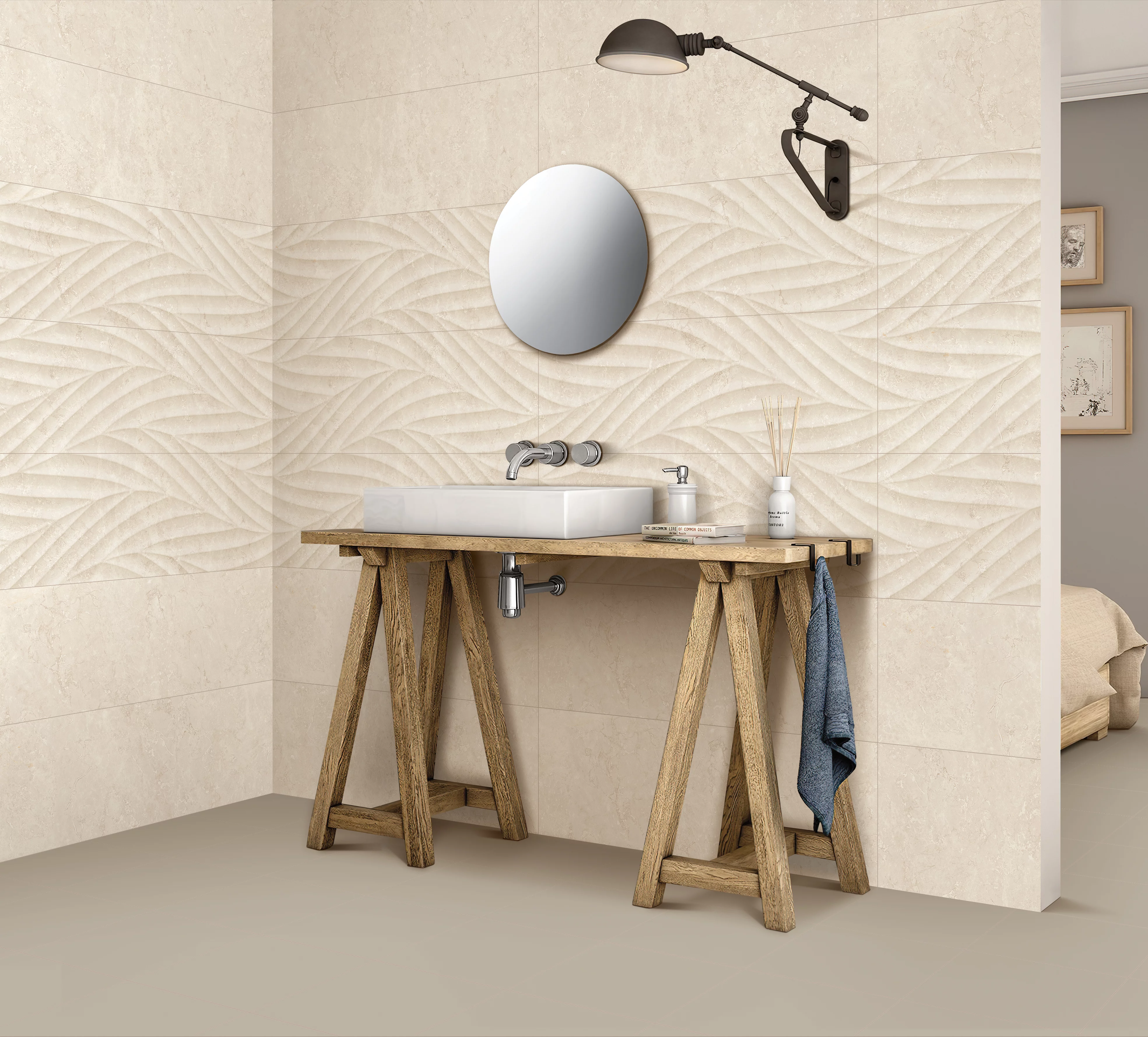 Faianța DELIGHT CREMA impresionează prin aspectul său inspirat de piatra naturală, cu vene delicate și variații cromatice subtile în tonuri de crem cald.