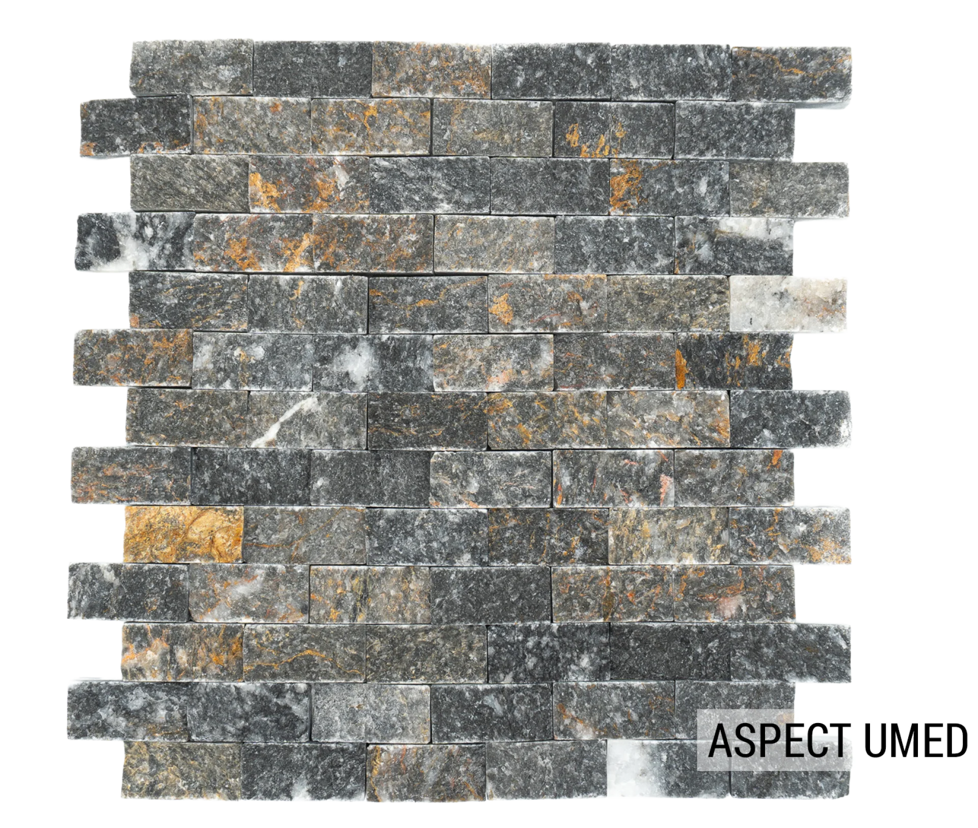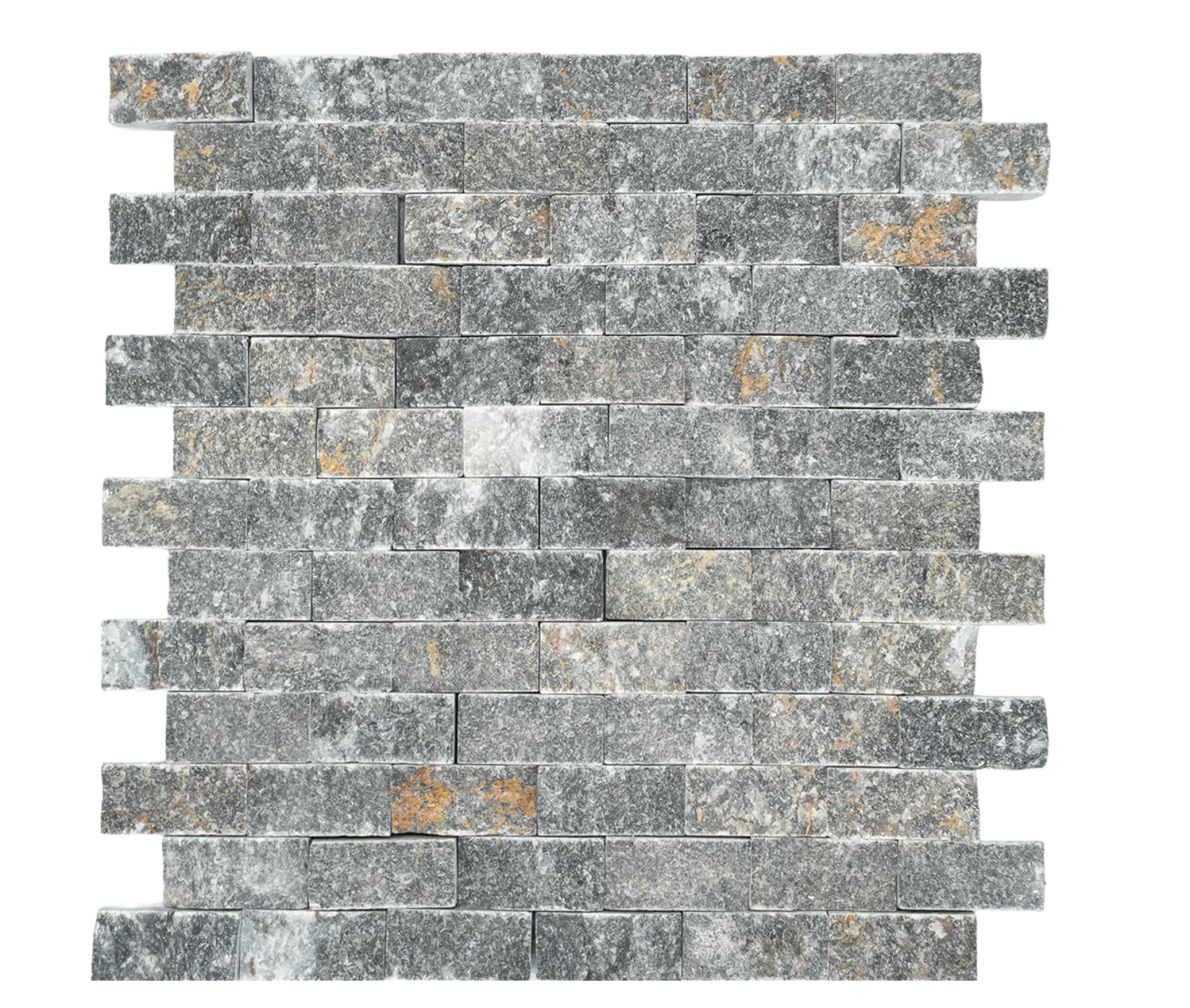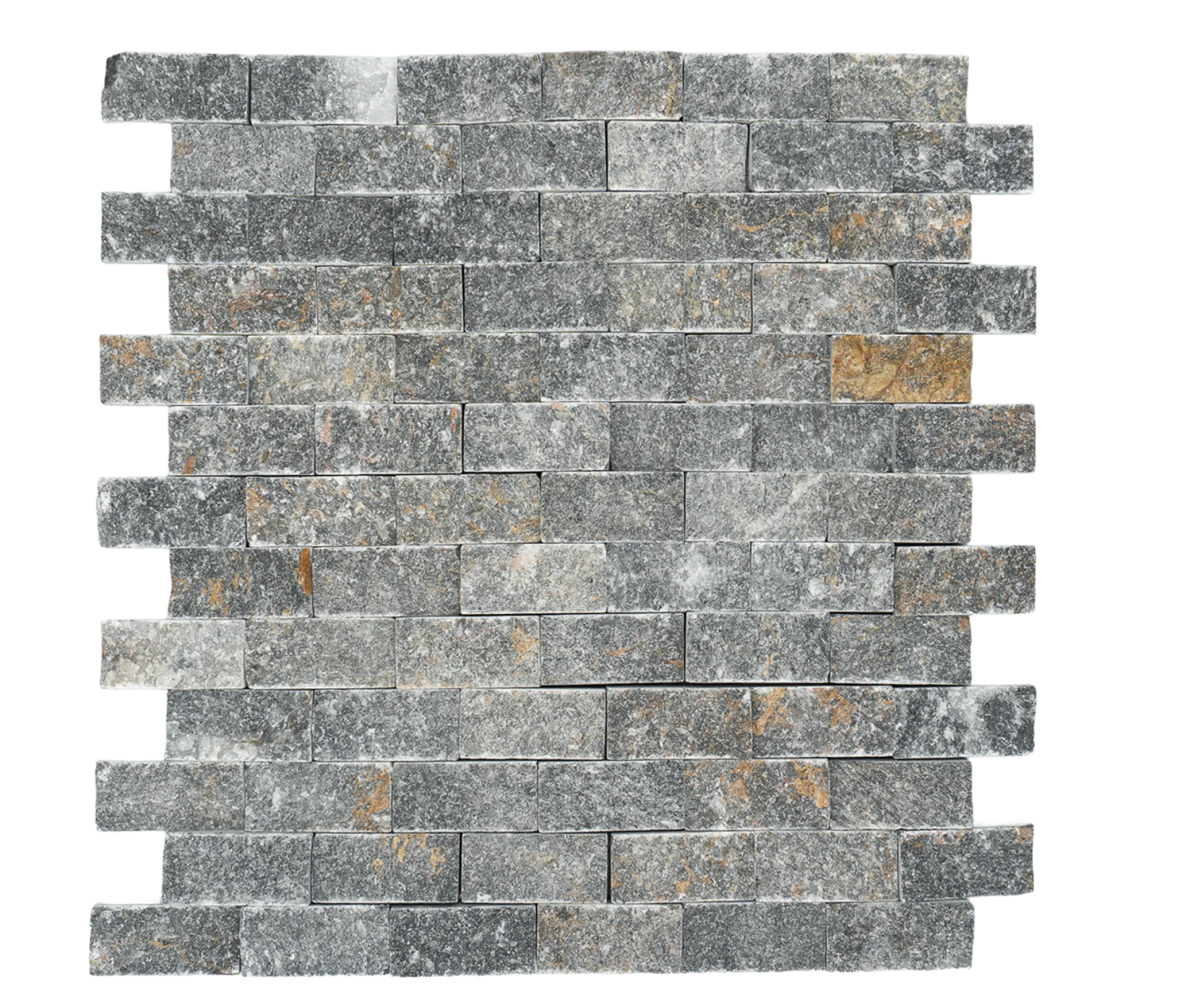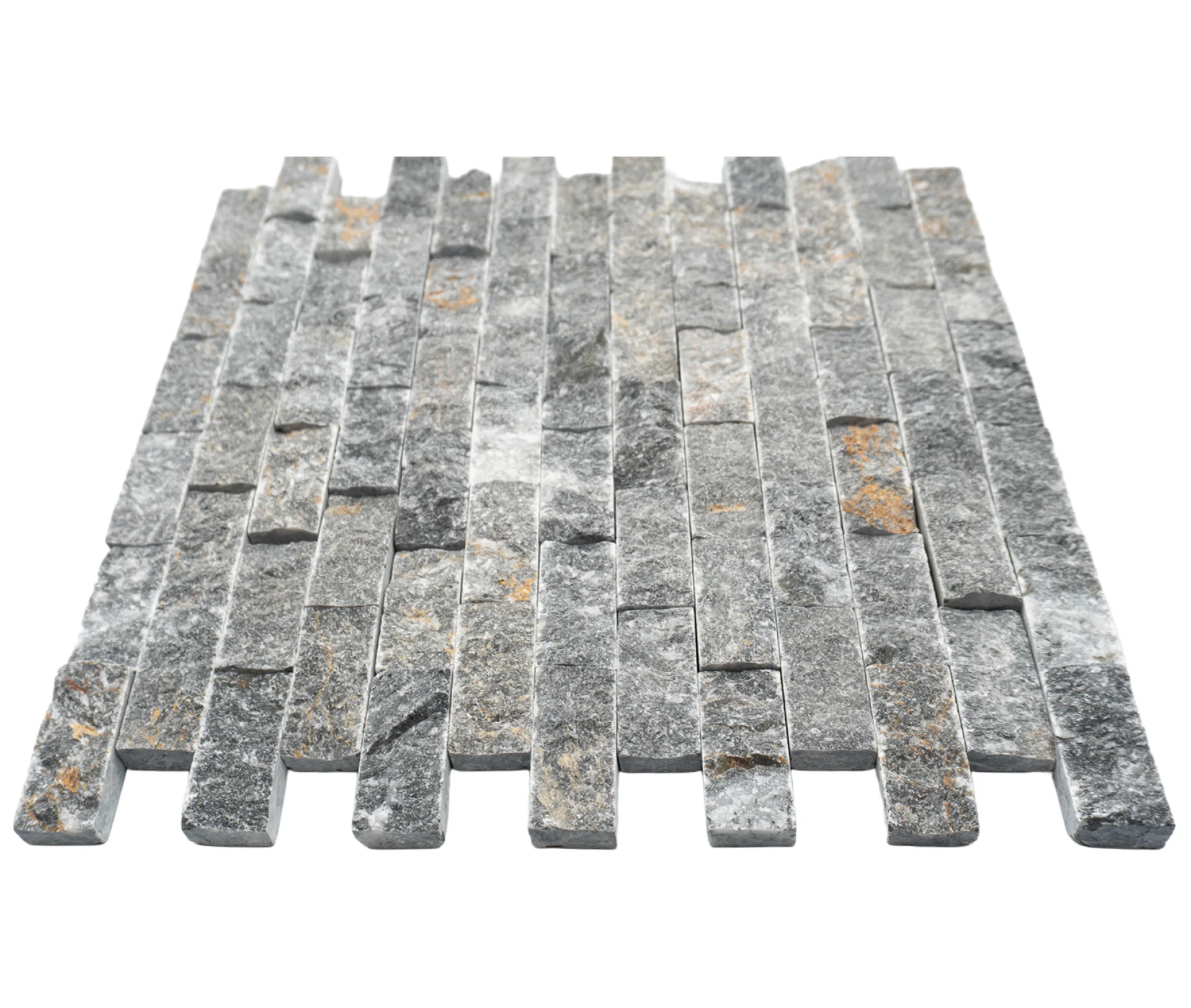 MOZAIC DIN TRAVERTIN DARK - 29X30.5cm, grosime variabila 1.5-1.8 cm, nuanțe naturale de maro și gri, finisaj split face, scapitat, perfect pentru decoruri verticale interioare și exterioare.