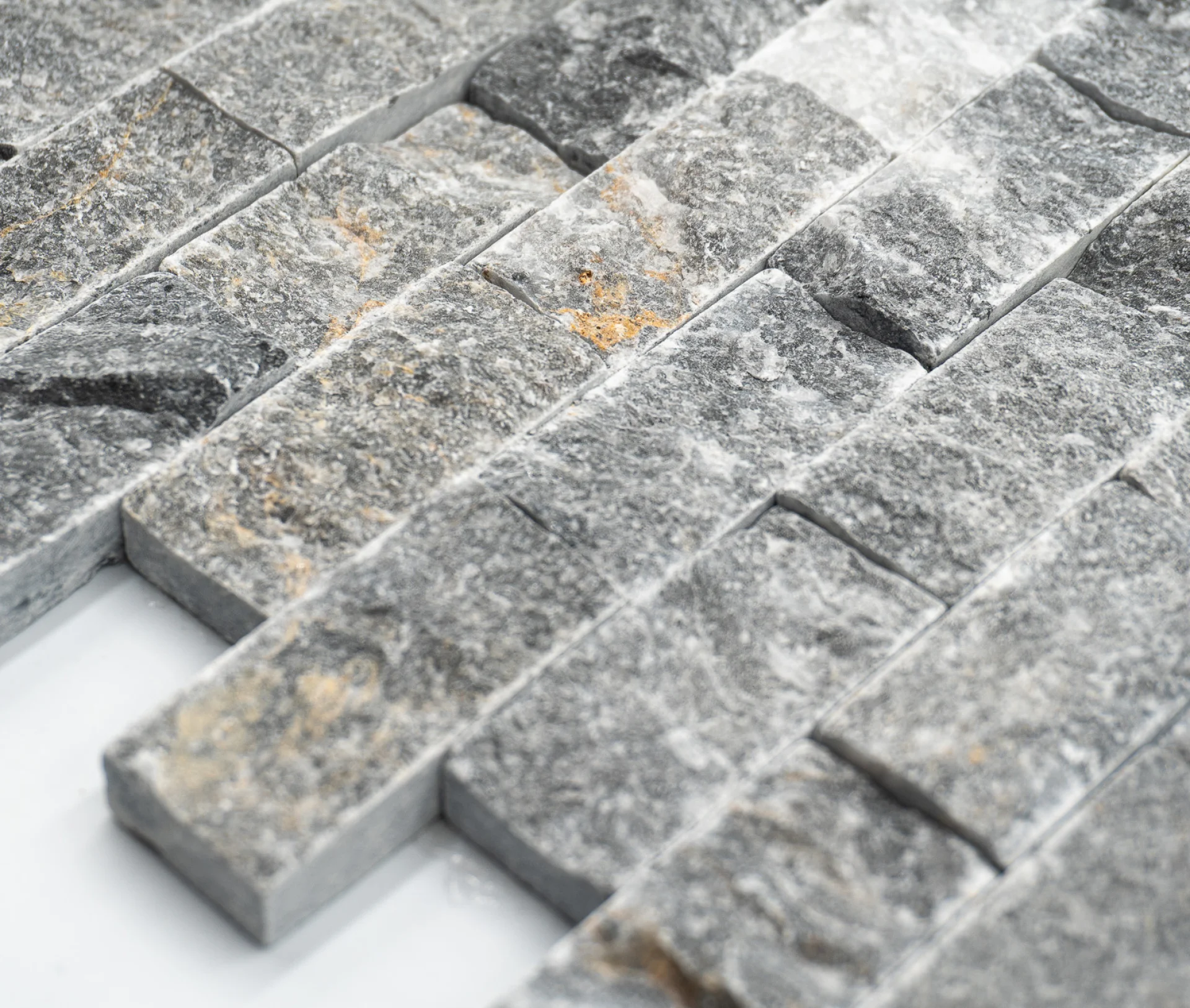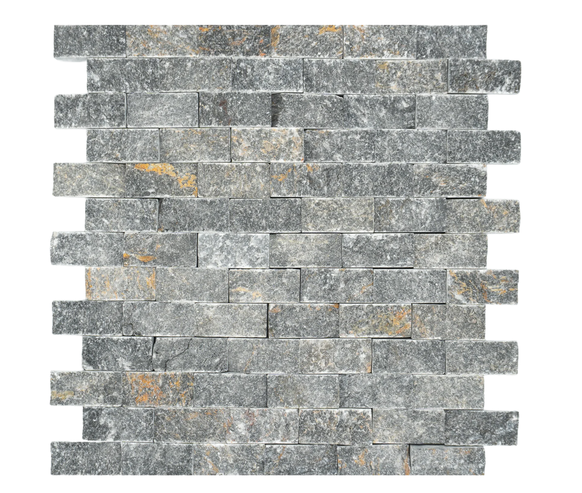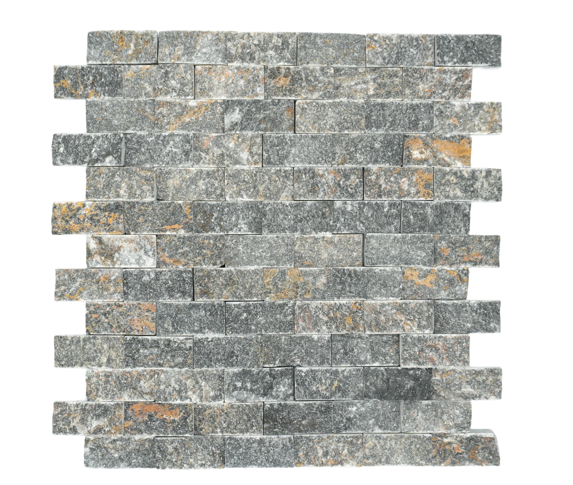 MOZAIC DIN TRAVERTIN DARK - 29X30.5cm, grosime variabila 1.5-1.8 cm, nuanțe naturale de maro și gri, finisaj split face, scapitat, perfect pentru decoruri verticale interioare și exterioare.