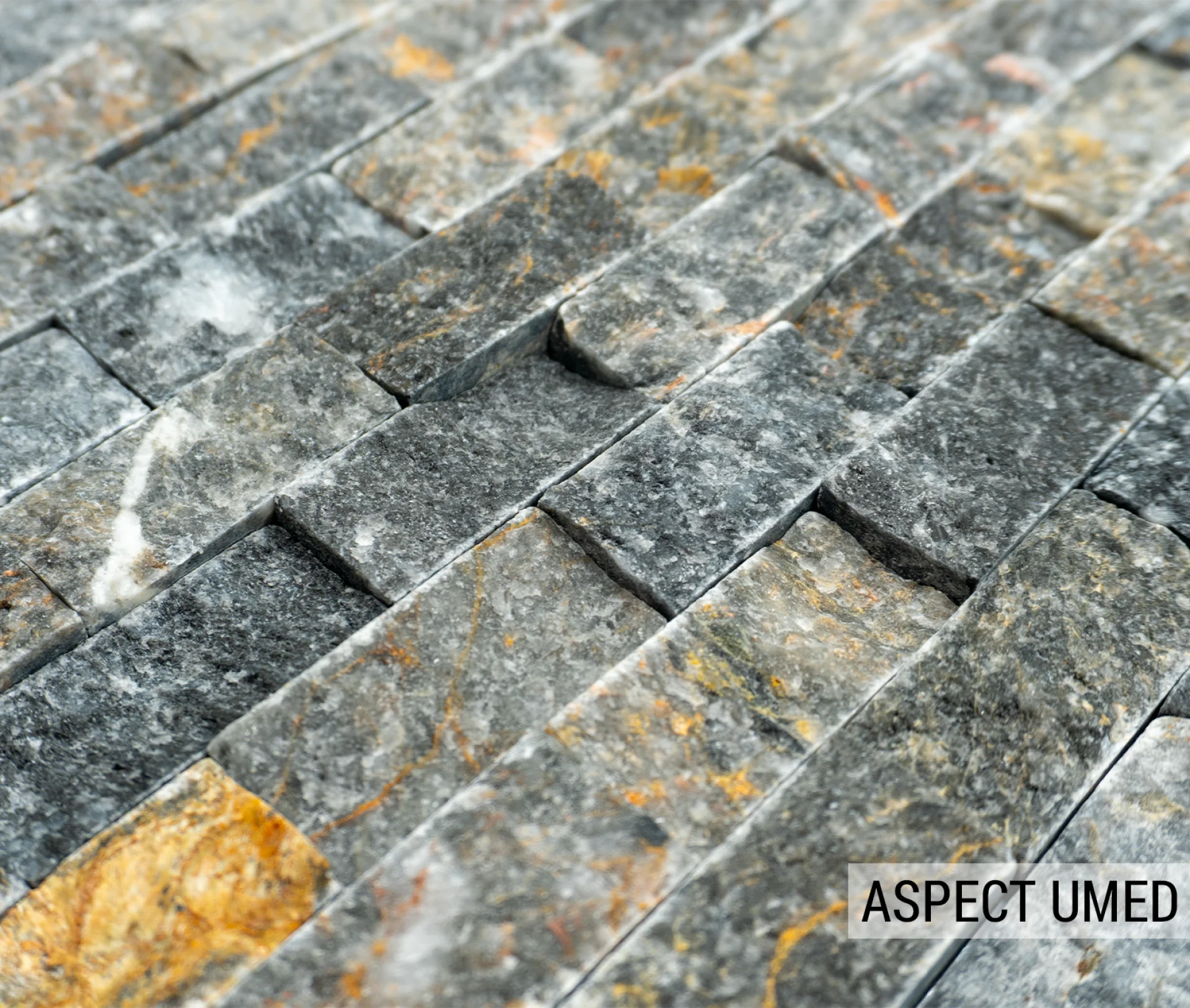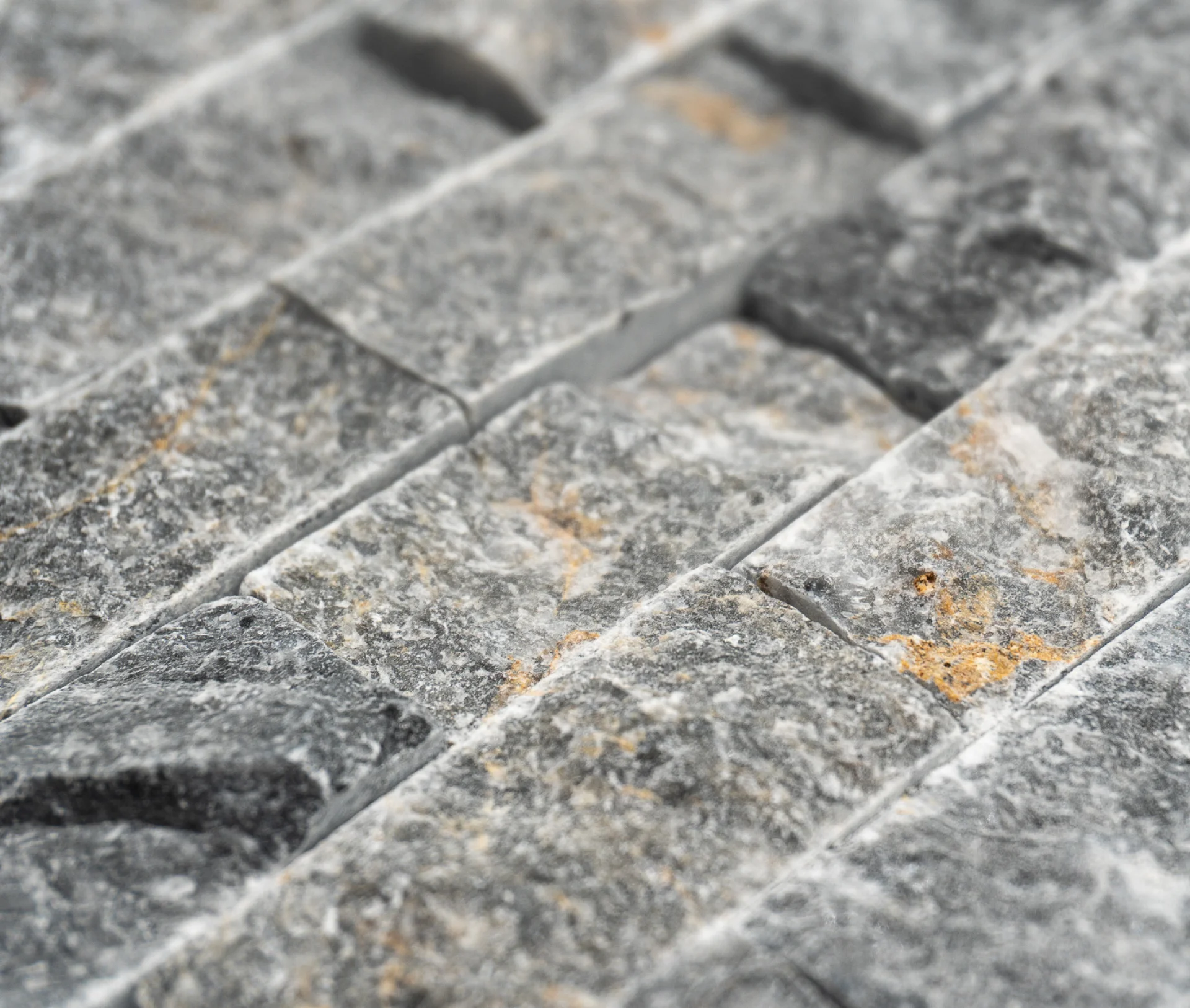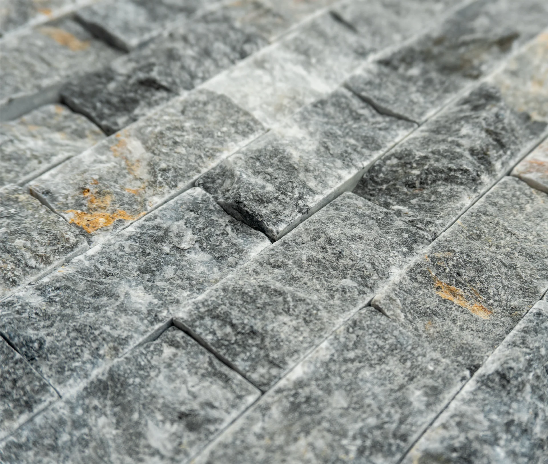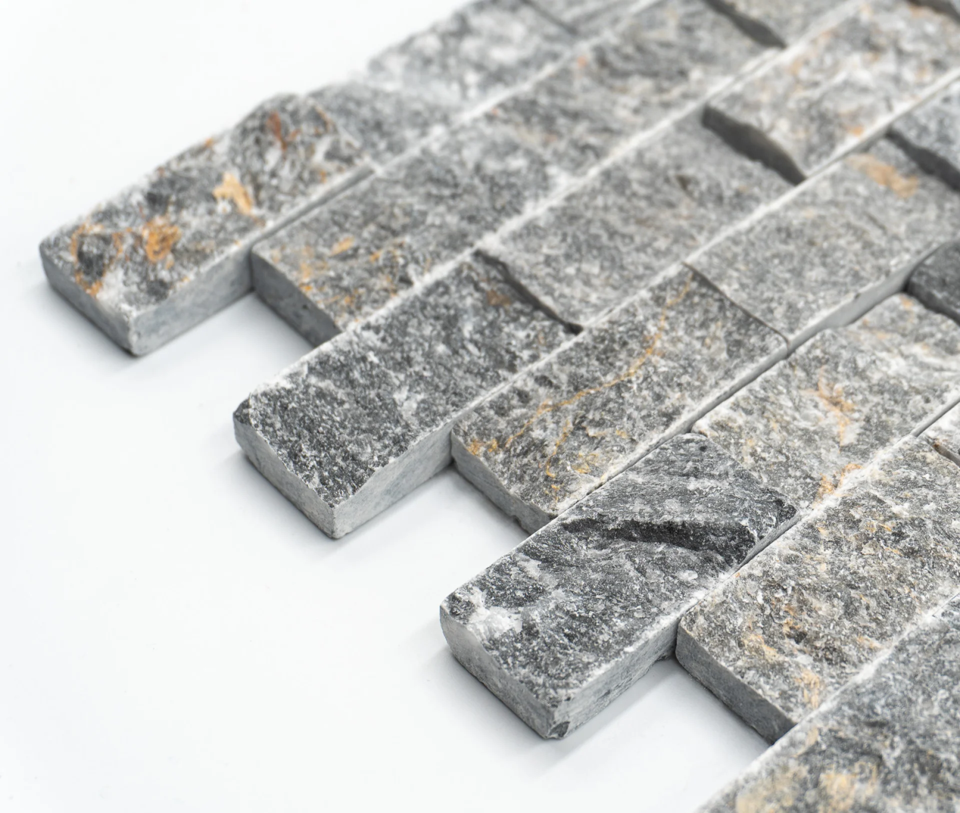 MOZAIC DIN TRAVERTIN DARK - 29X30.5cm, grosime variabila 1.5-1.8 cm, nuanțe naturale de maro și gri, finisaj split face, scapitat, perfect pentru decoruri verticale interioare și exterioare.