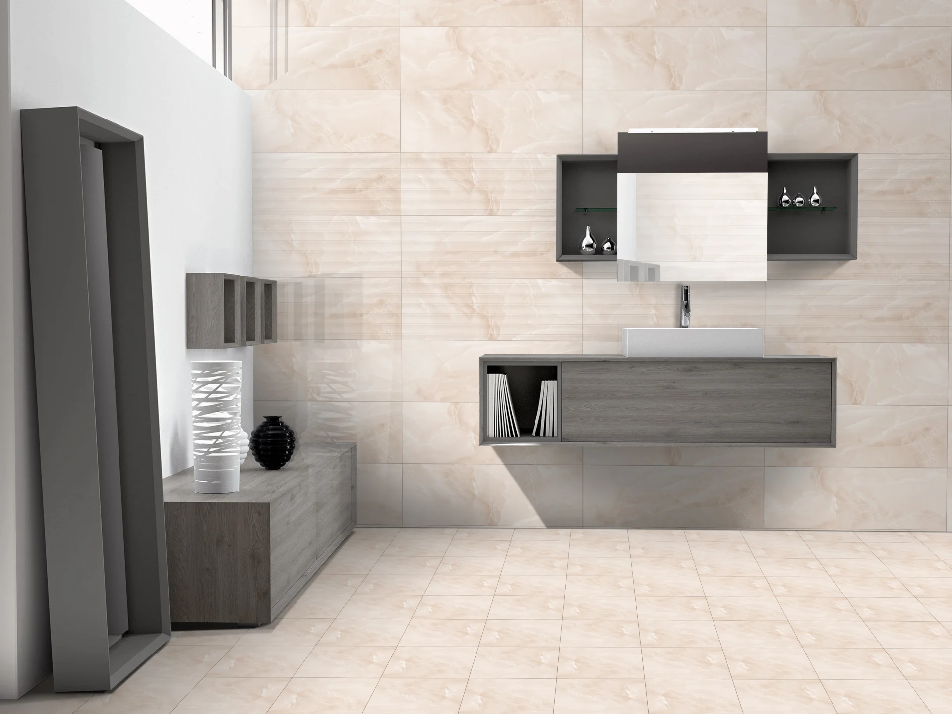 Designul delicat inspirat de structura translucidă a onixului este completat de tonuri calde de crem-bej, potrivite pentru amenajări clasice sau moderne.