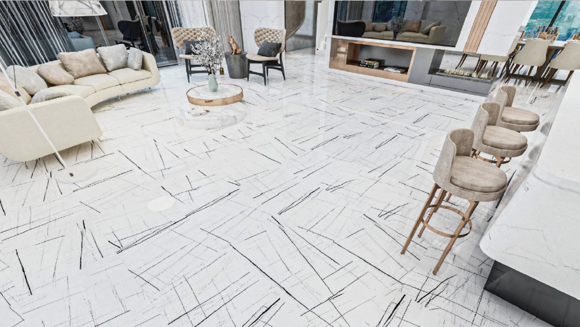 Gresia ELEGANT 6001 LIGHT este o gresie cu design contemporan, ce combină un fundal alb luminos cu vene subțiri, grafice, în nuanțe de negru intens.