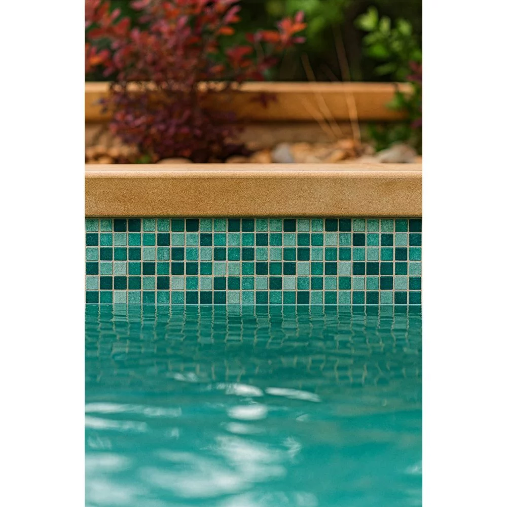 Realizat din sticlă, acest mozaic cu finisaj mat este potrivit atât pentru pereți interiori cât și pentru suprafețe expuse la umiditate, inclusiv piscine.