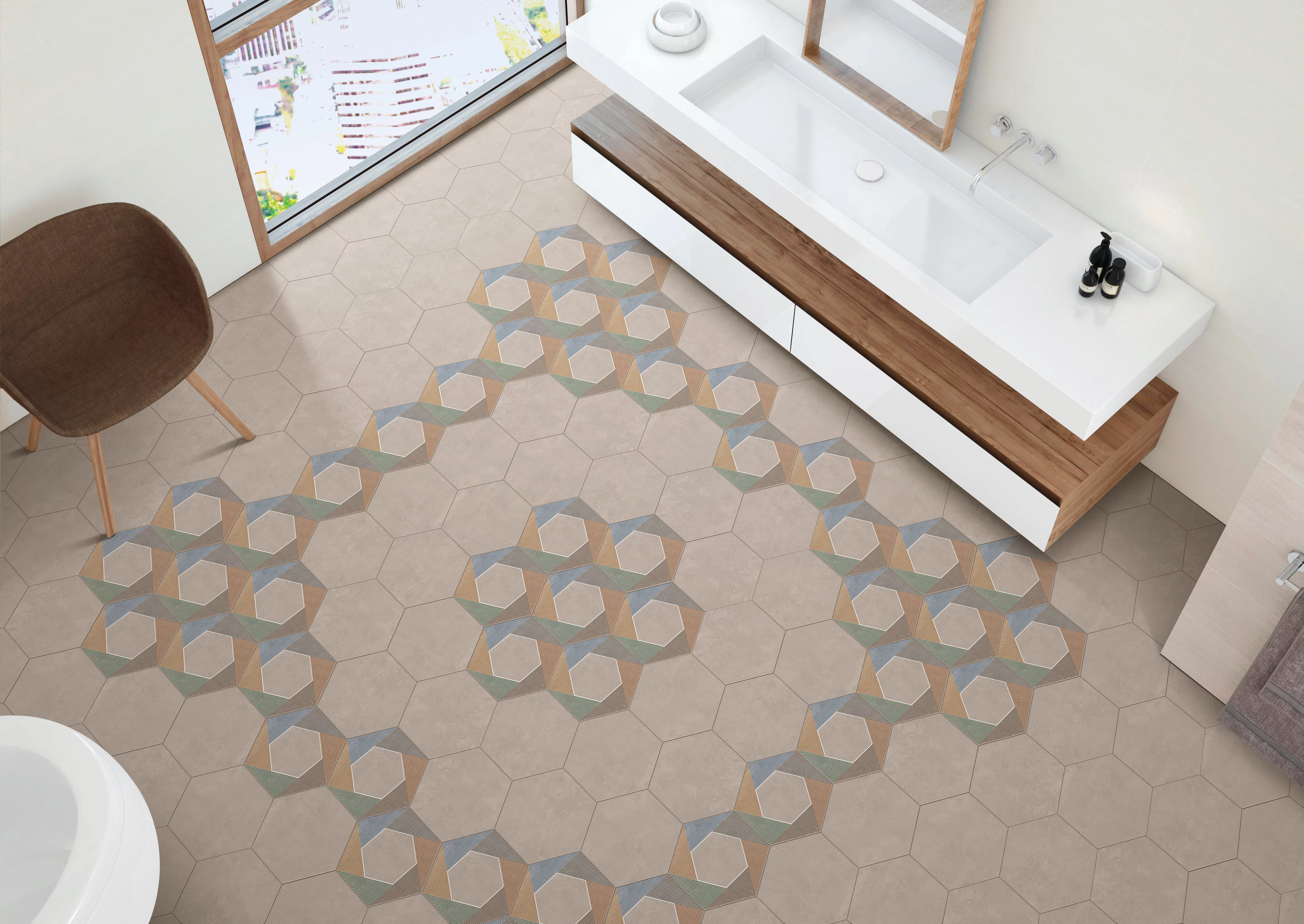 GRESIE HEXAGON ARTICA DÉCOR îmbină estetica modernă cu versatilitatea practică a ceramicii portelanate.