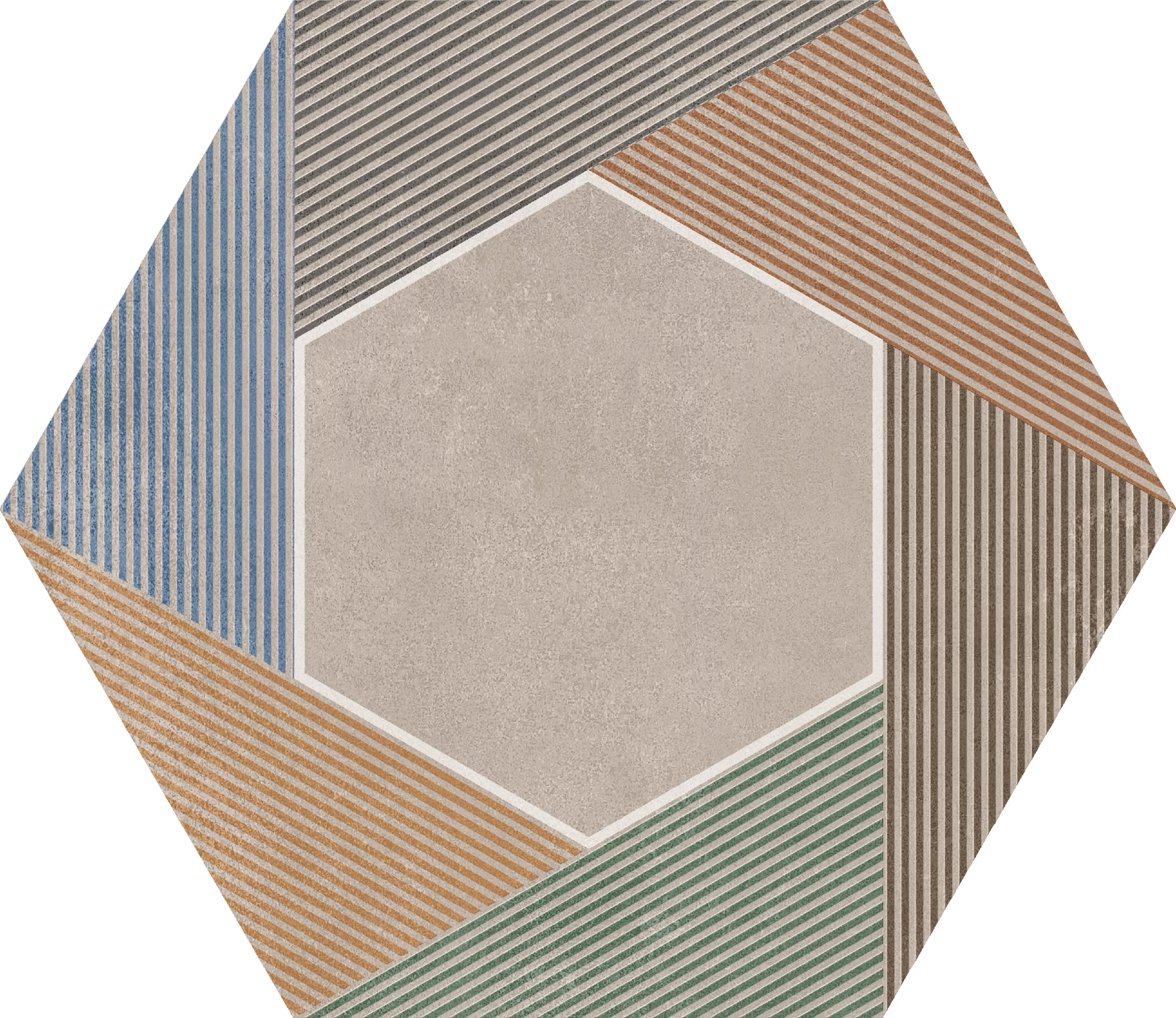 GRESIE HEXAGON ARTICA DÉCOR - 21.5x25 cm, portelanată, glazurată, nerectificata și mată, ideală pentru interior și exterior. Design geometric multicolor pentru spații creative și moderne.