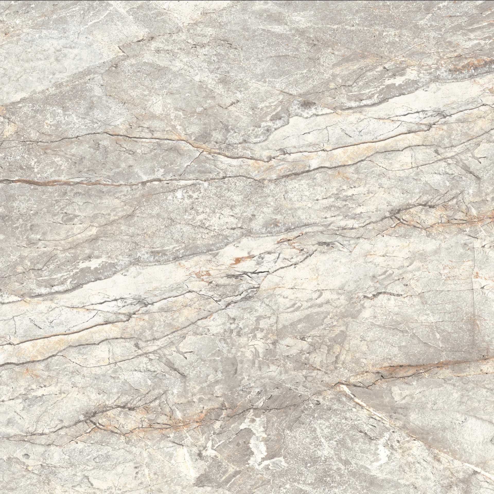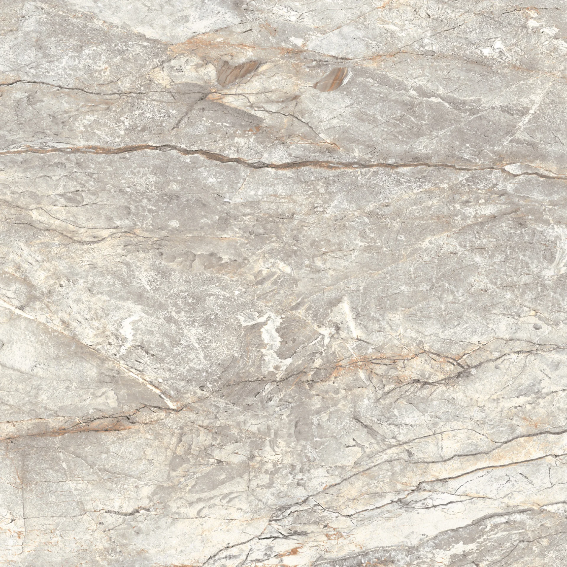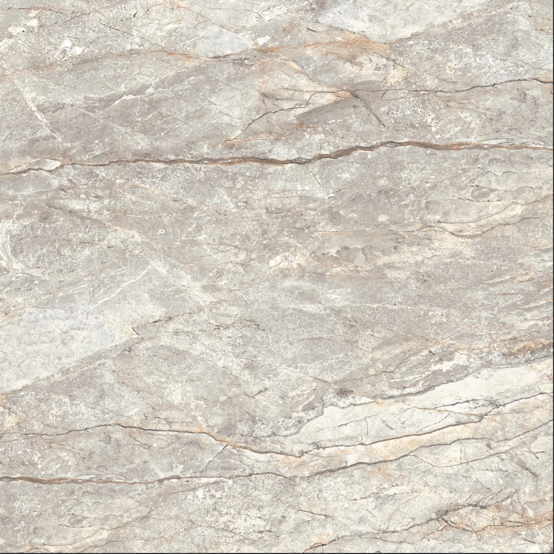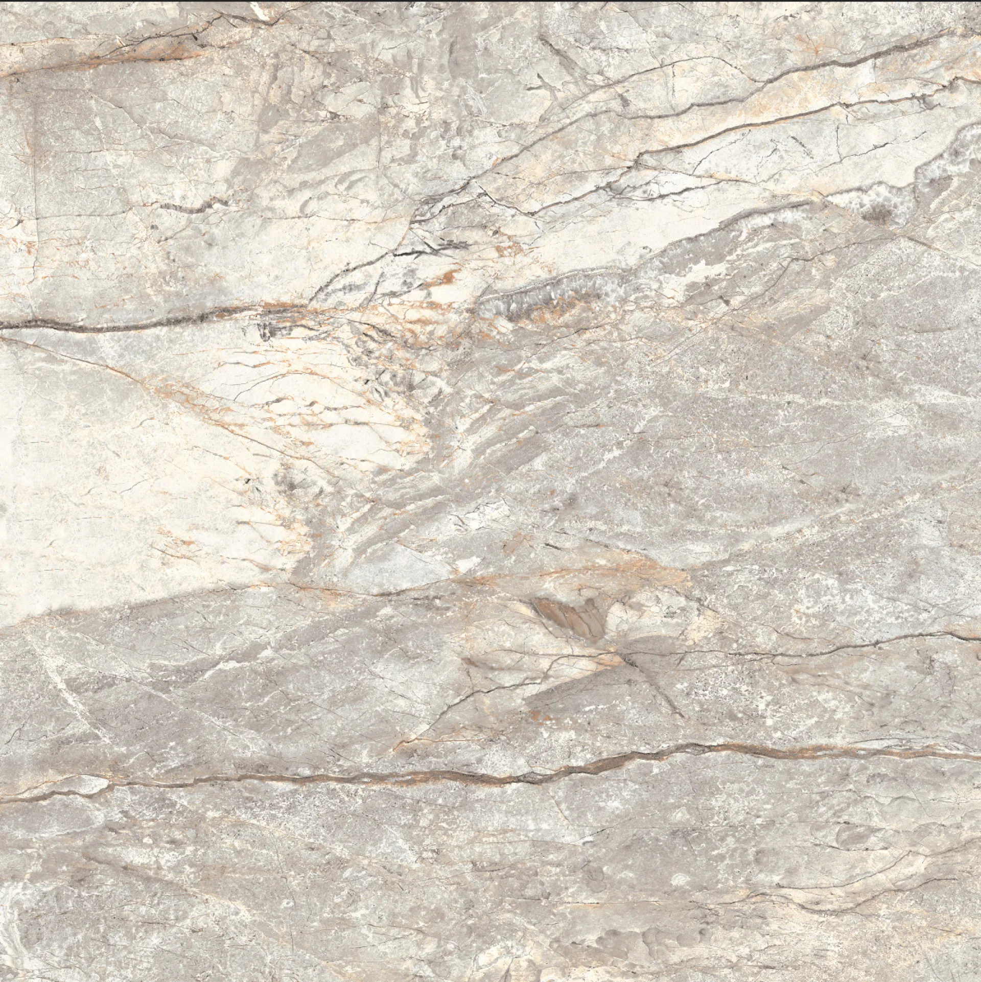 GRESIE RIVER GREY MT - 60X60 cm, porțelanată, glazurata, aspect de piatră naturală în tonuri de gri cu vene bej-aurii, finisaj mat, ideală pentru interior și exterior.