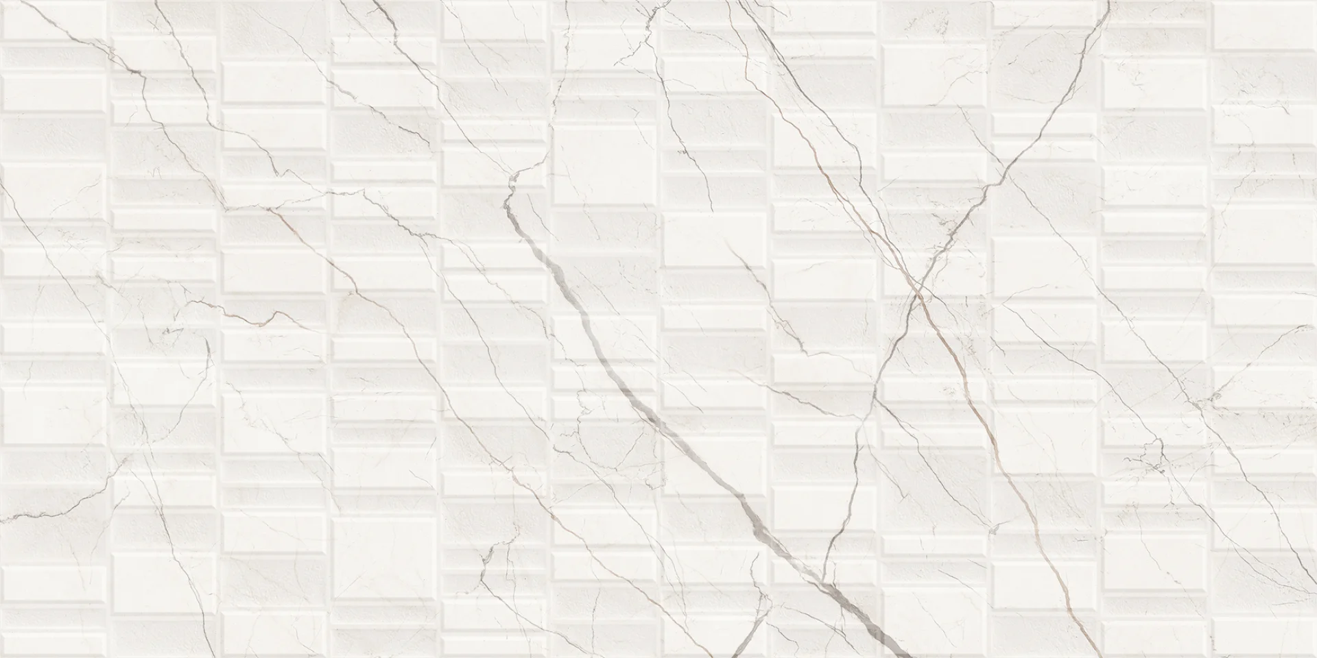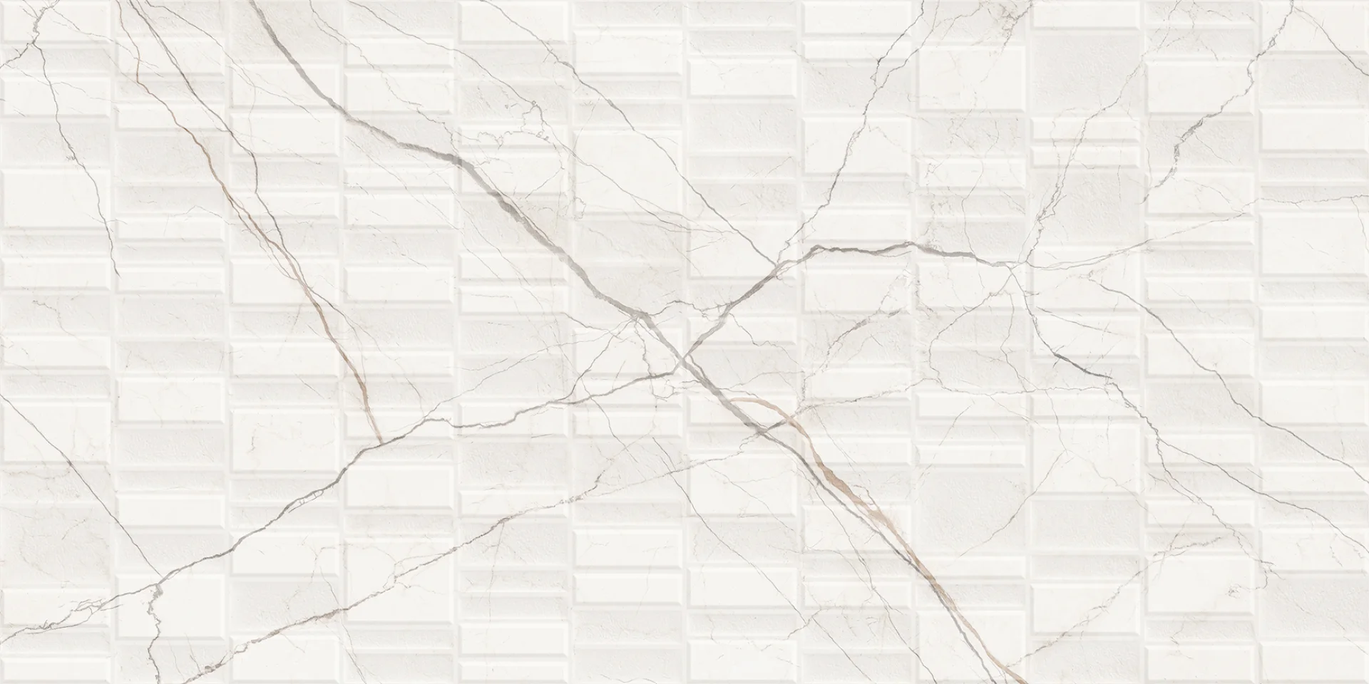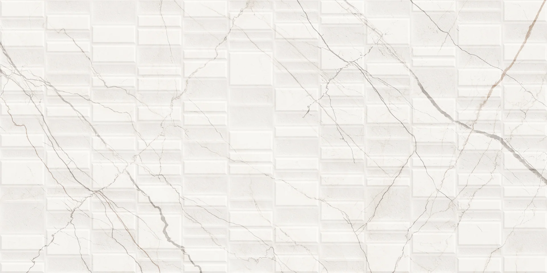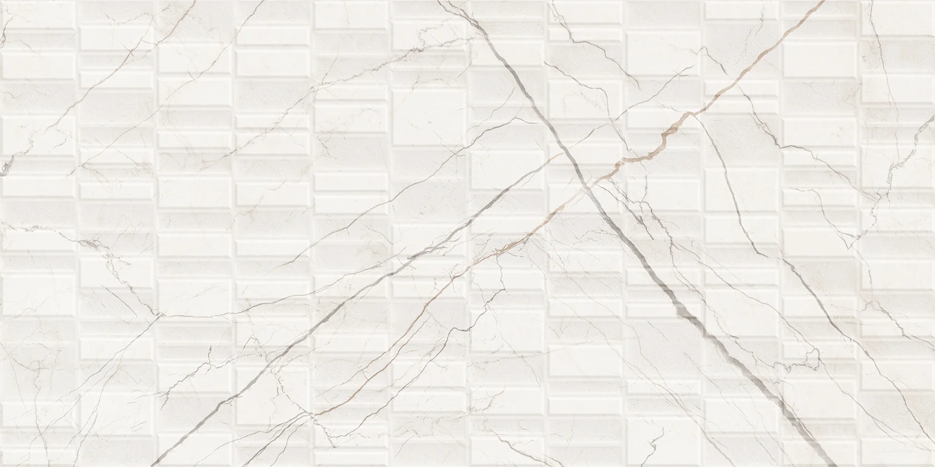 GRESIE ARISTO BIANCO VEGA - 60X120 cm, porțelanată, glazurata, aspect de marmură crem cu inserții gri și maro, finisaj mat cu carving embosat în figuri geometrice, recomandată în special pentru placarea pereților decorativi.