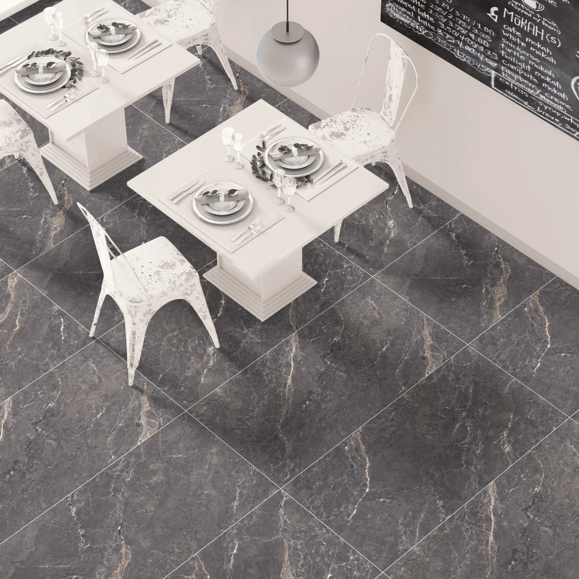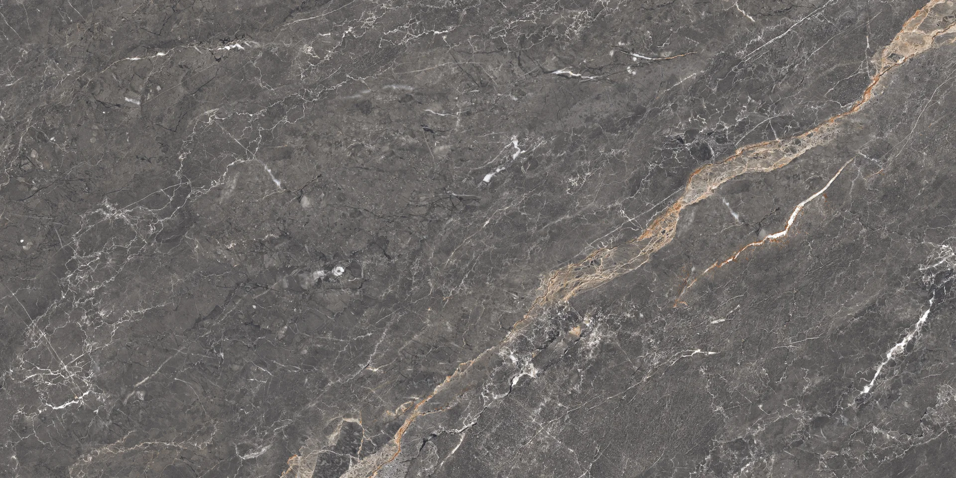 Gresia CARVING ORBITO MIST reproduce cu fidelitate eleganța marmurei naturale, într-o combinație sofisticată de tonuri negre profunde, evidențiate de vene subtile gri și accente calde bej.