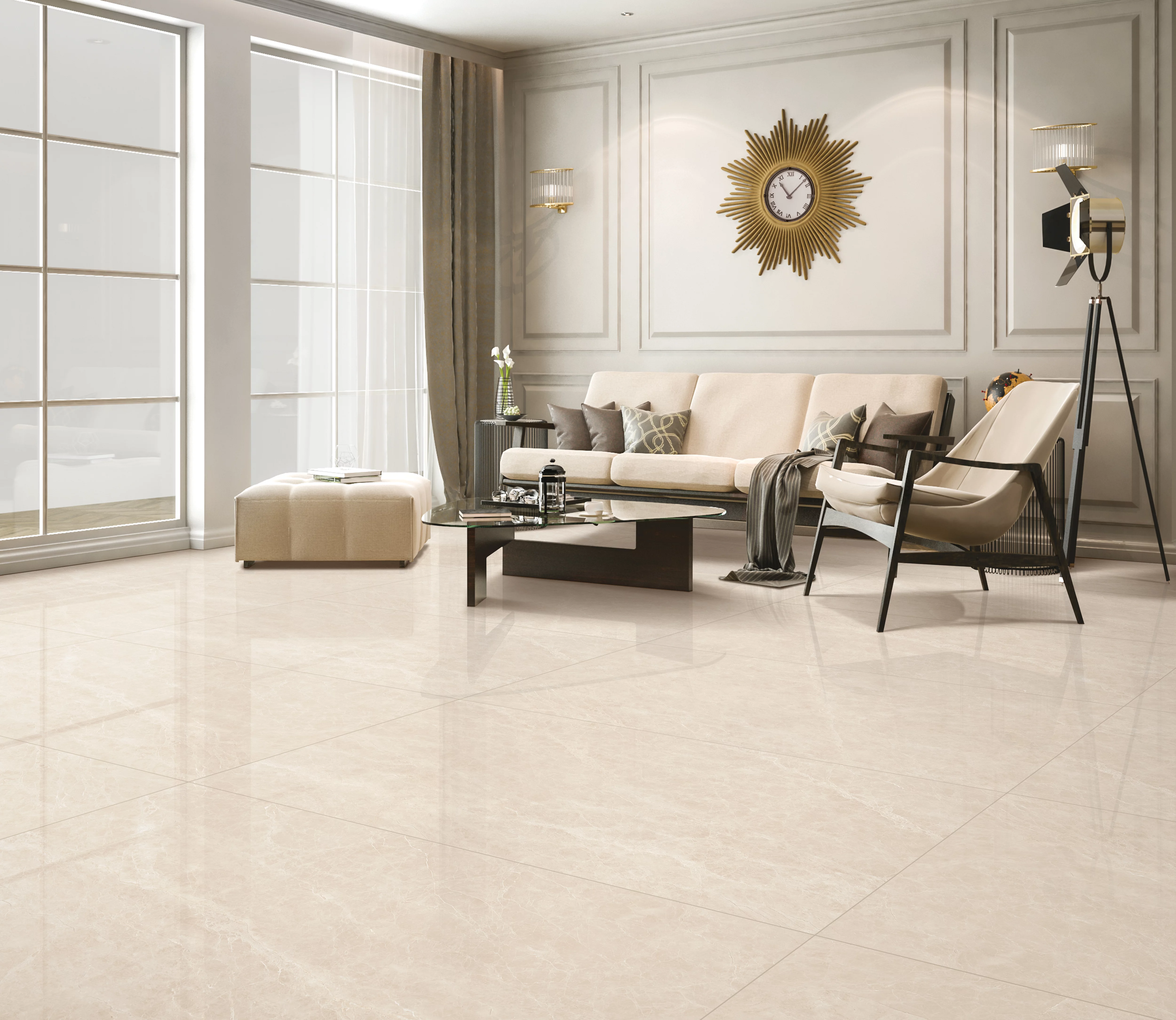 GRESIE FUME EMPERADOR LATTE - 80X160 cm, recomandata pentru interior si exterior, culoare bej deschis, portelanata, glazurata, rectificata, finisaj lucios High Glossy. Ideală pentru amenajări interioare moderne, compatibilă cu încălzirea în pardoseală.