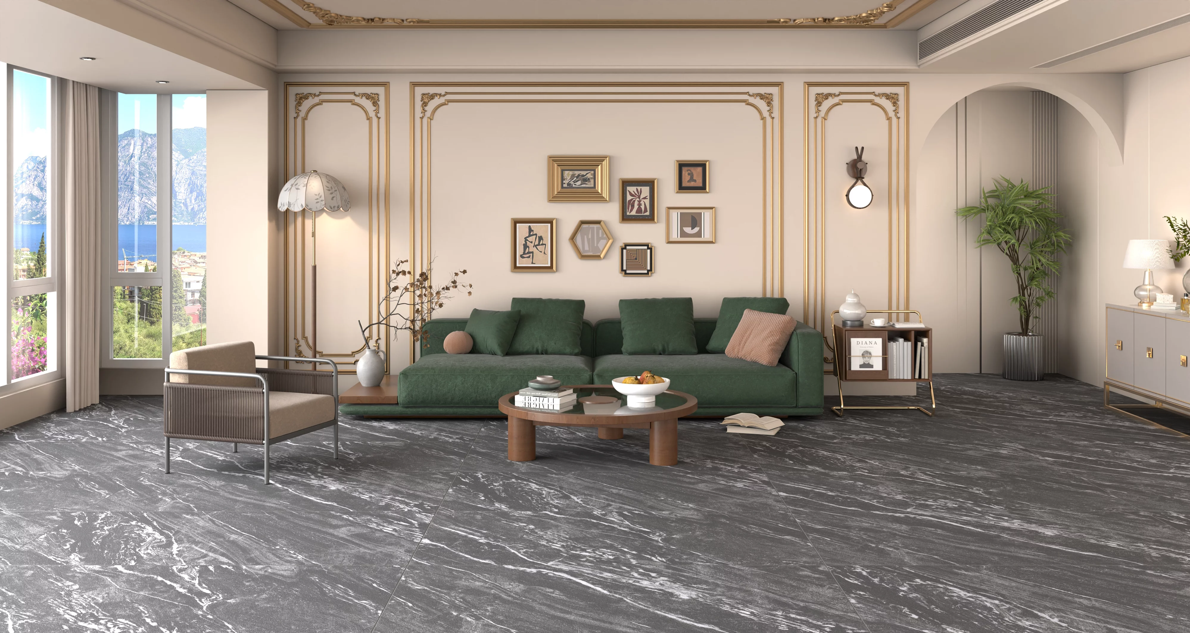 Gresia MONTANA MYSTERIOUS impresionează printr-un design elegant și dramatic, cu un fond negru intens și venaturi albe, ce amintesc de textura naturală a marmurei.