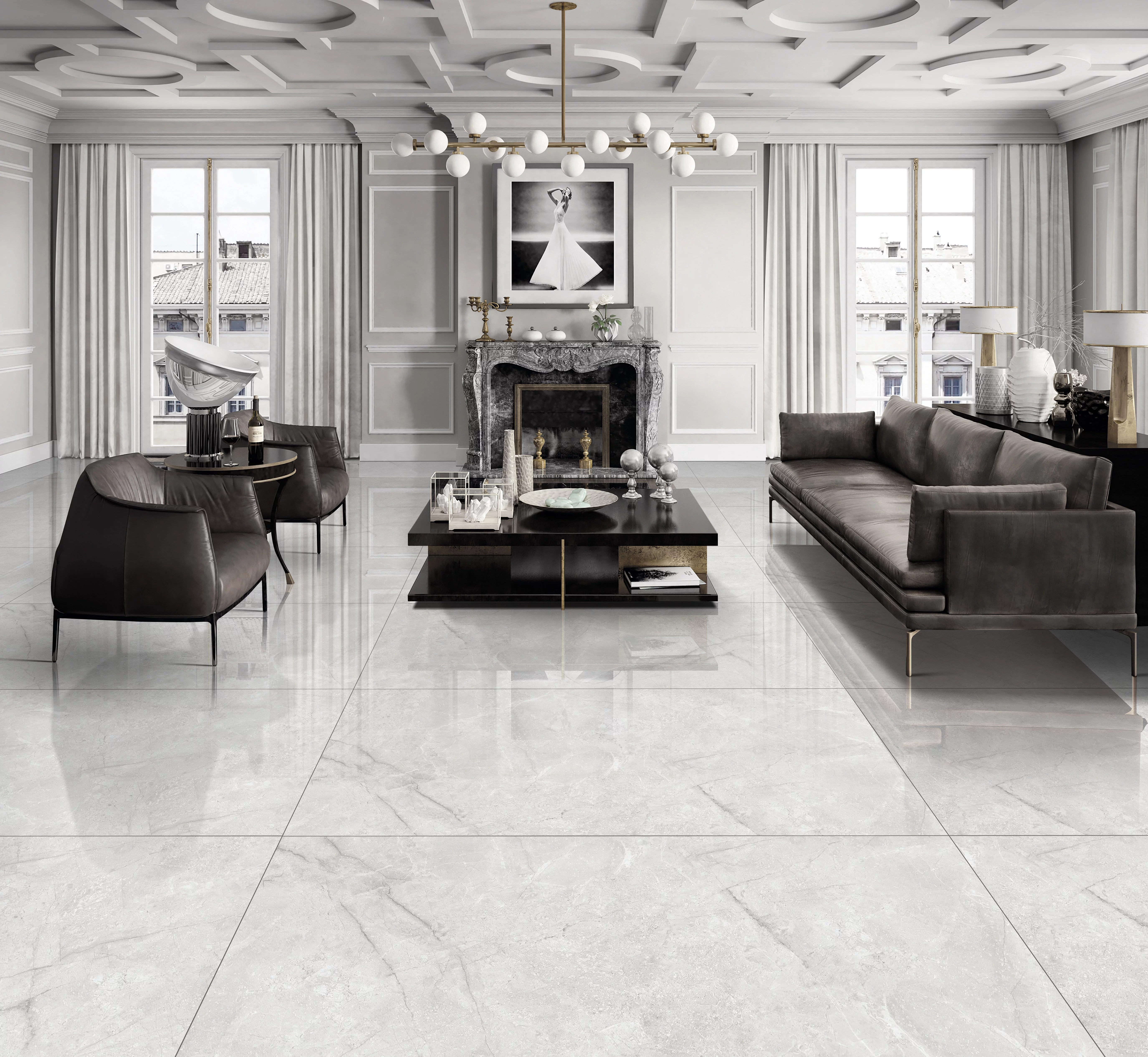 Gresia MAKRANA WHITE, cu finisaj lucios, în nuanțe elegante de alb-gri deschis, cu aspect de marmură rafinată.