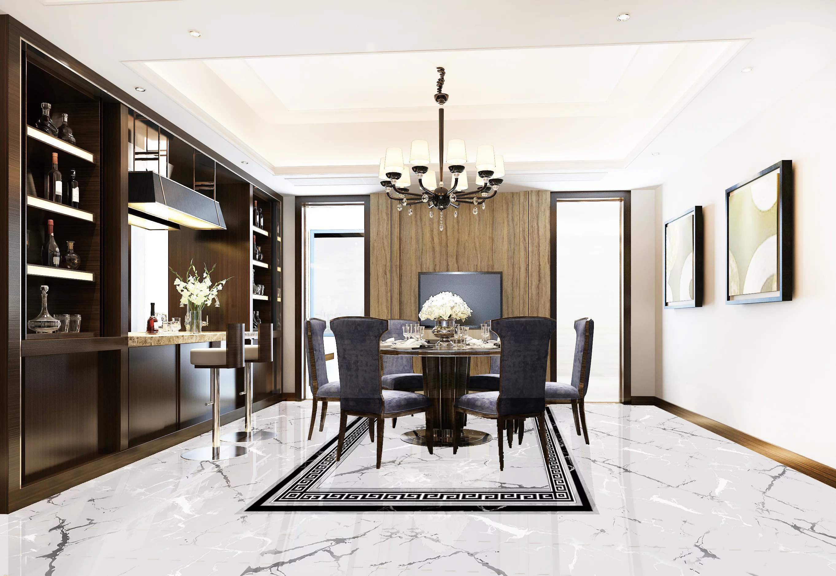 GRESIE PORTELANATA, GLAZURATA, INTERIOR, RECTIFICATA, FINISAJ LUCIOS CU EFET DE CARVING ARGINTIU MODEL UNITAR, RATA DE ABSORBTIE A APEI SUB 0.5%, COMPATIBILA CU SISTEME DE INCALZIRE IN PARDOSEALA, RECOMANDATA PENTRU PLACARE PARDOSEALA SI PERETI