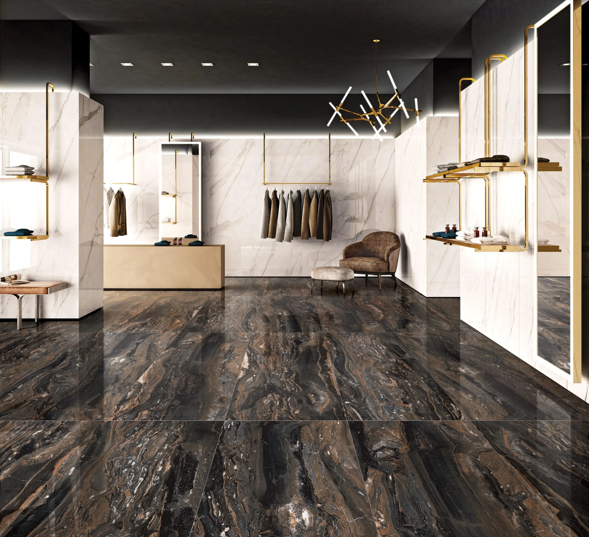GRESIE GALAXY BLACK HG - 60X120 cm, porțelanată, glazurata, rectificata, în nuanțe de negru intens, gri și maro cu accente aurii, finisaj super lucios High Glossy, pentru interioare sofisticate.