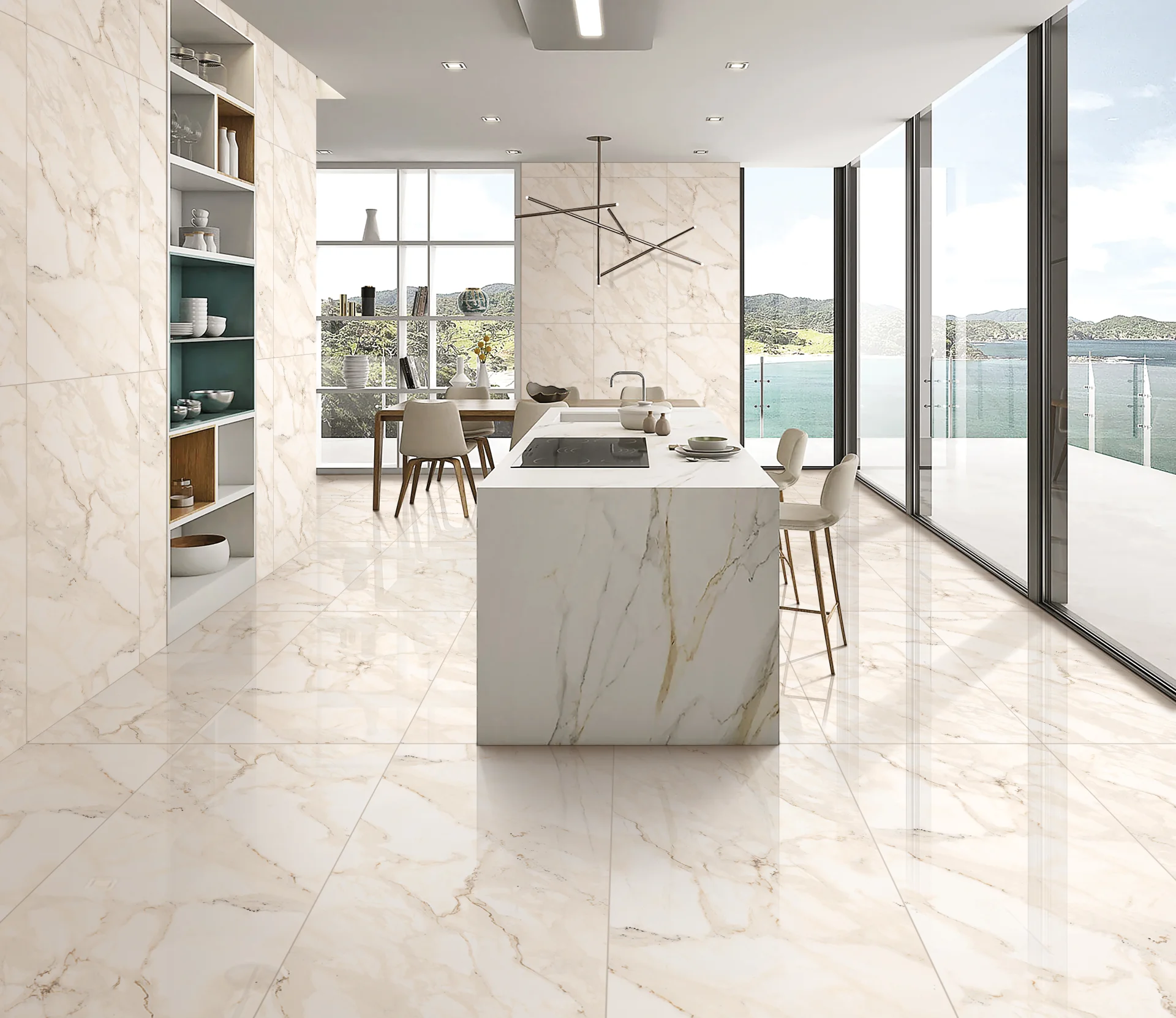 GRESIE SAHARA GREEN - 60X120 cm, porțelanată lucioasă, rectificata, în nuanțe de alb cu viniuri gri și accente bej-maronii, pentru un aspect elegant și rafinat.