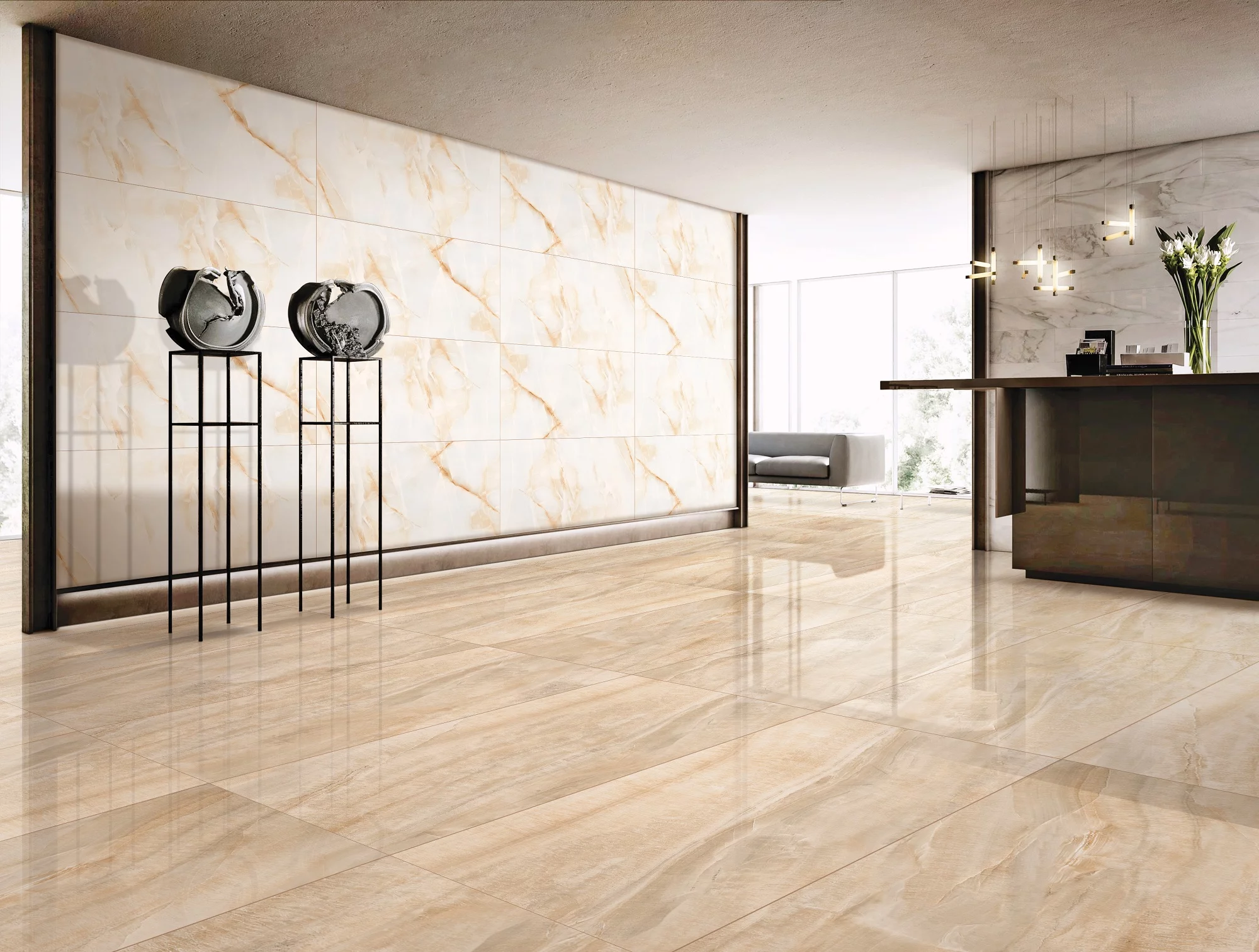 Tonurile de bej cald și crem, îmbinate cu accente subtile gri-verzui, creează o atmosferă luminoasă și sofisticată, potrivită pentru spații rezidențiale sau comerciale.