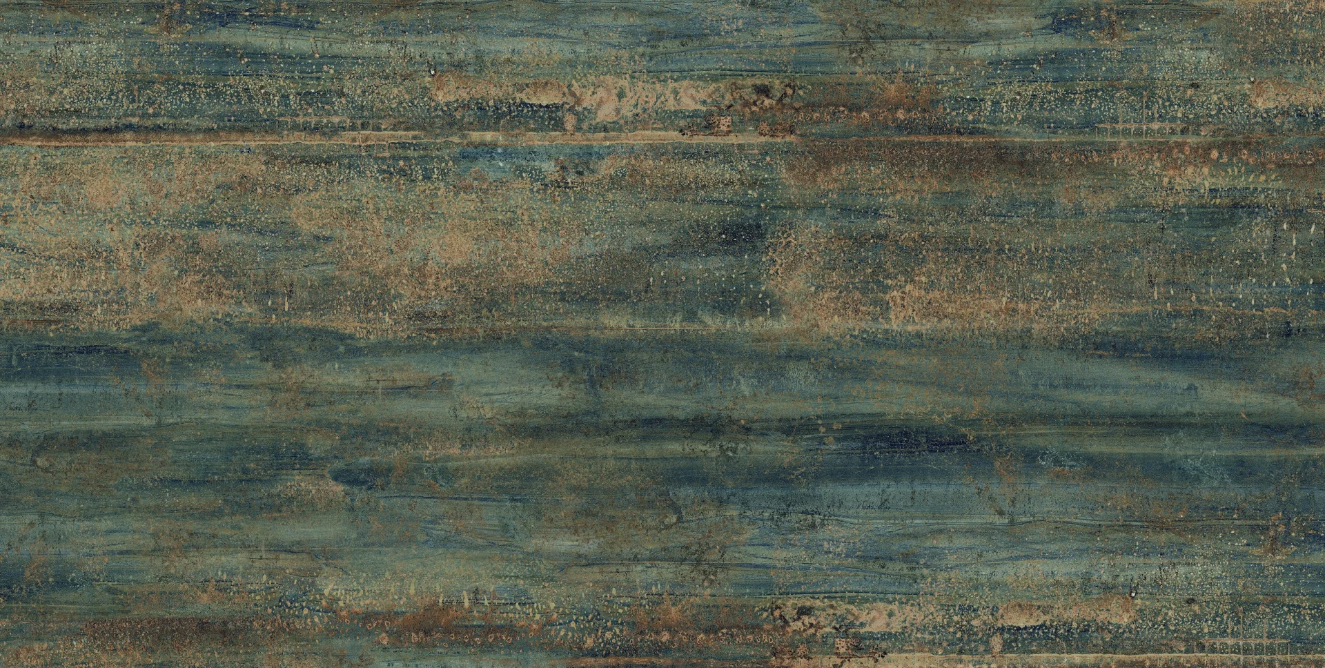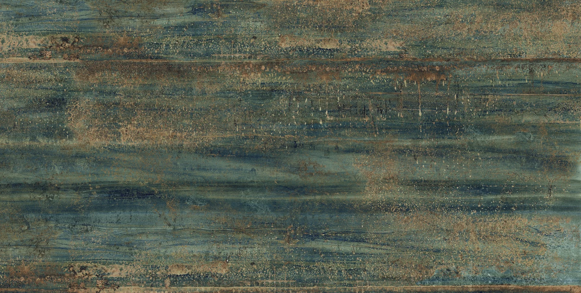 GRESIE ALIENA - 60X120 cm, porțelanată lucioasă high glossy, în nuanțe de albastru-petrol cu accente ruginii și maronii, pentru un efect modern și sofisticat.
