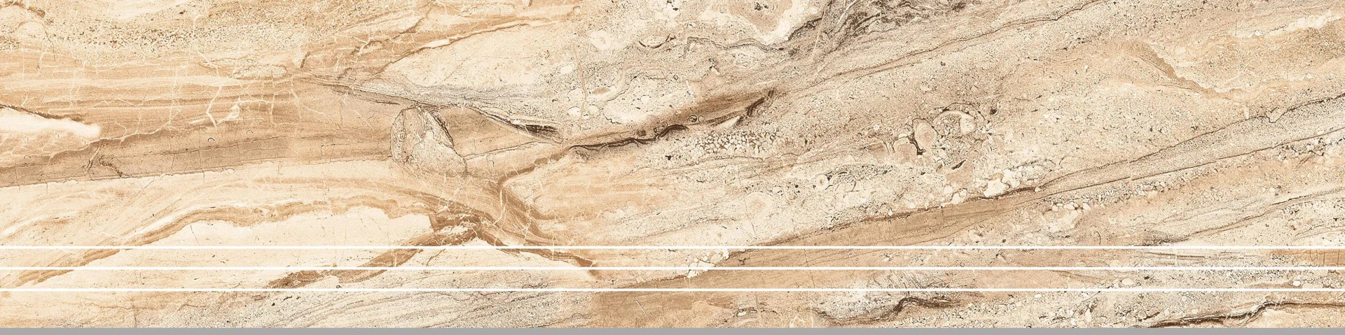 TREAPTA GRESIE IRNO BEIGE - 120X30 cm, porțelanată lucioasă, bej cu aspect de marmura naturala, rectificata, cu rotunjire și 3 adâncituri antiderapante pe una dintre laturi, pentru interior și exterior.