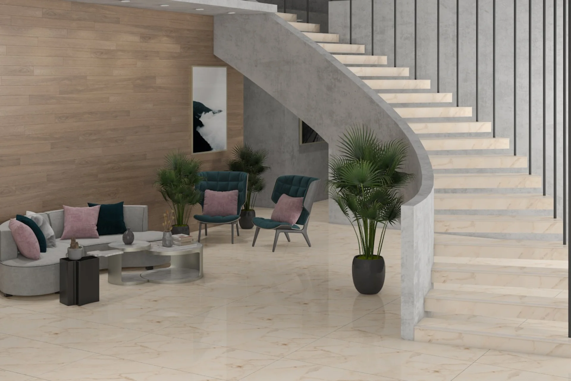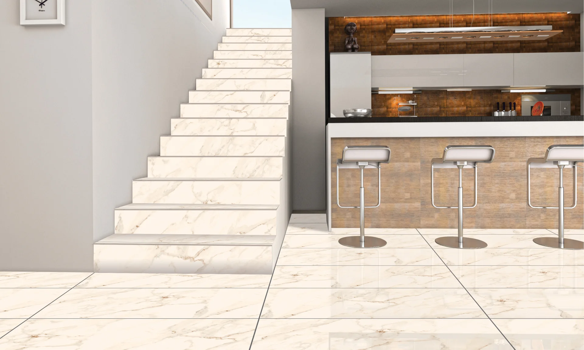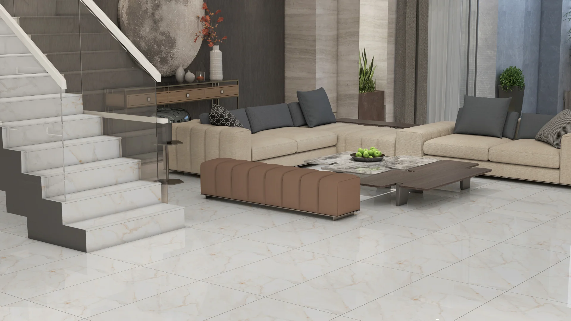 Designul inspirat din marmură naturală este evidențiat prin tonuri calde de crem și alb, cu venaturi maronii subtile, ce oferă profunzime și unicitate fiecărei plăci.
