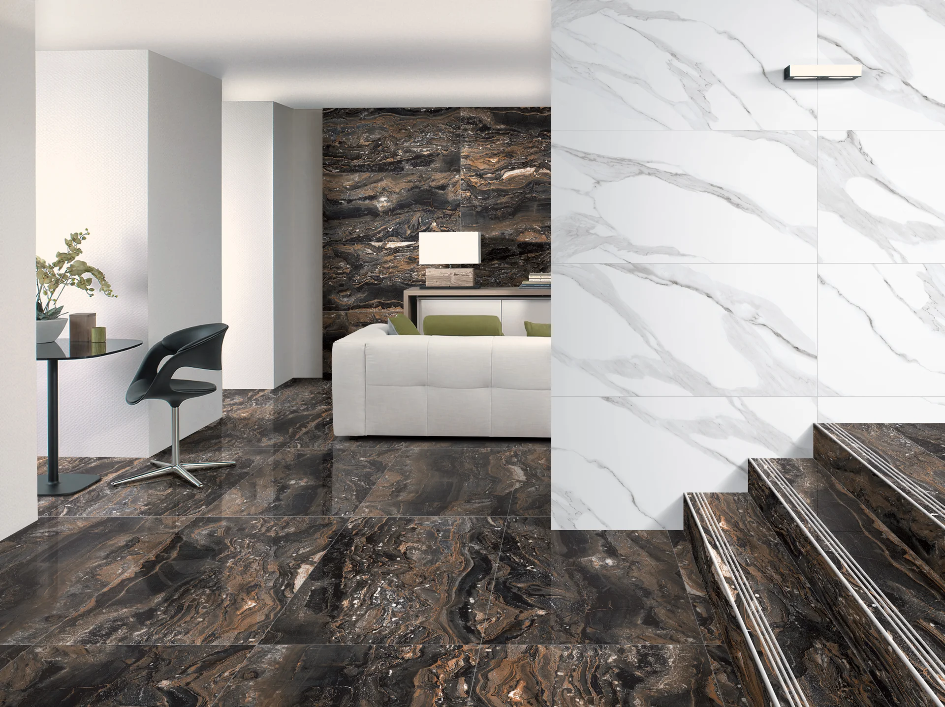 Această placă porțelanată, glazurată, cu finisaj super lucios high-glossy și margini rectificate, aduce un efect vizual de marmură neagră intensă, cu vene naturale în tonuri de cupru și alb.