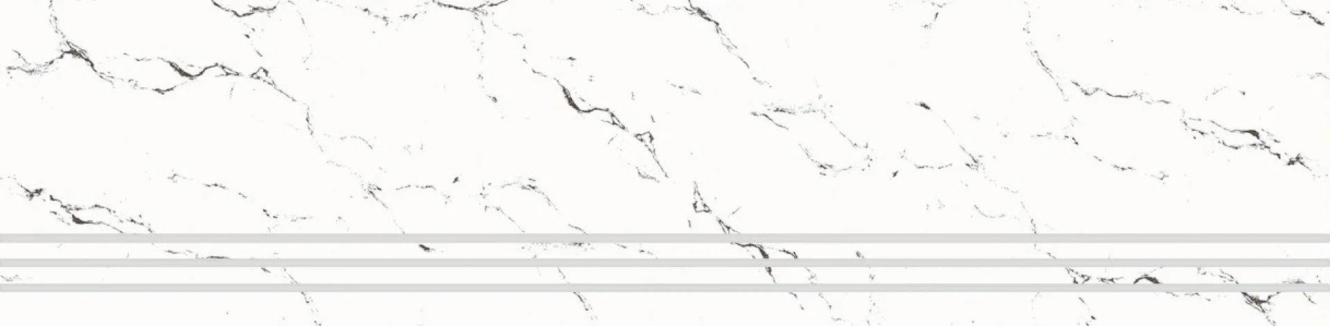 TREAPTA GRESIE CARGO WHITE - 30X120 cm, porțelanată, glazurata, rectificata, cu finisaj lucios și design elegant alb cu vene gri, ideală pentru scări interioare sau exterioare.