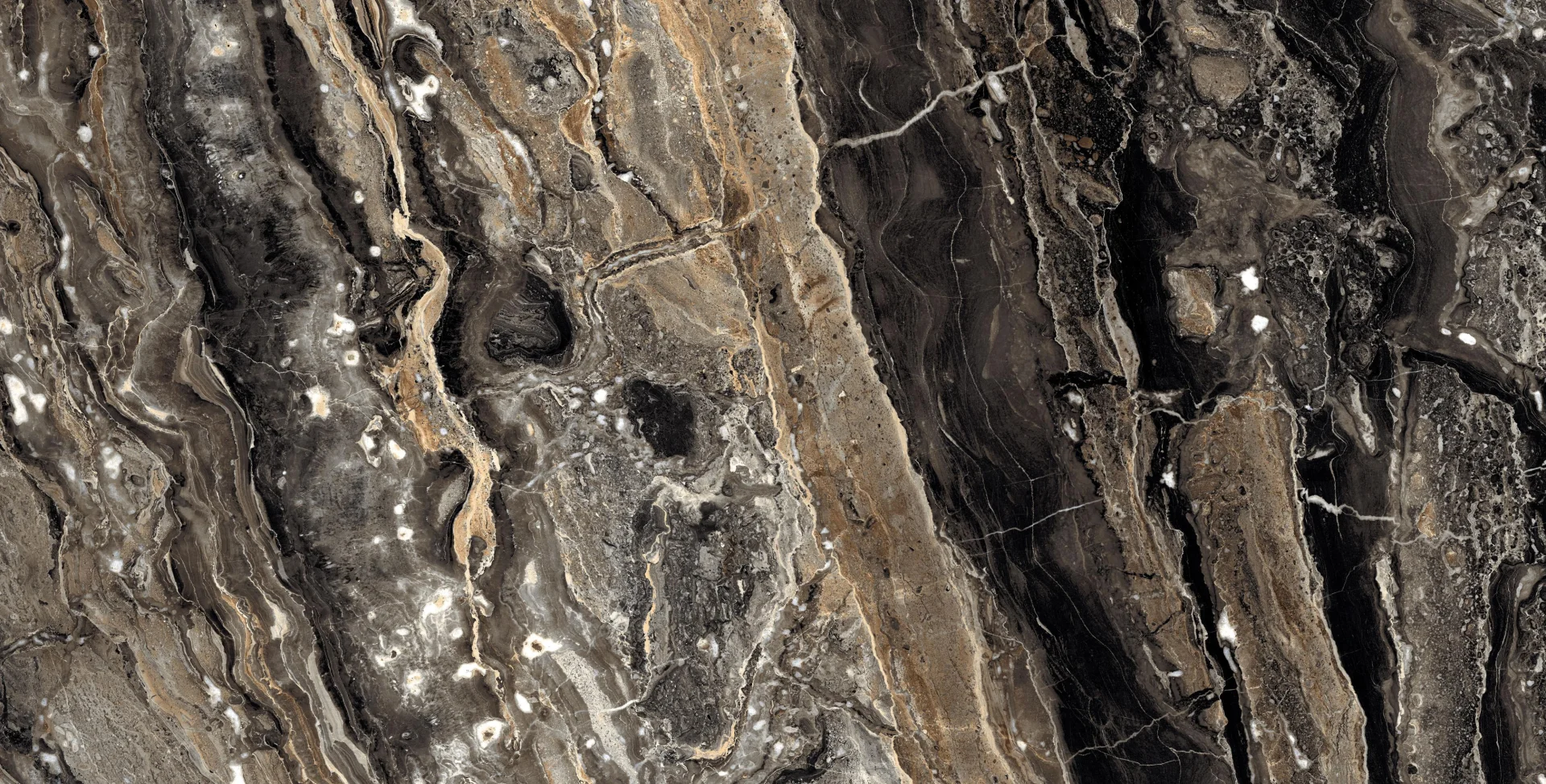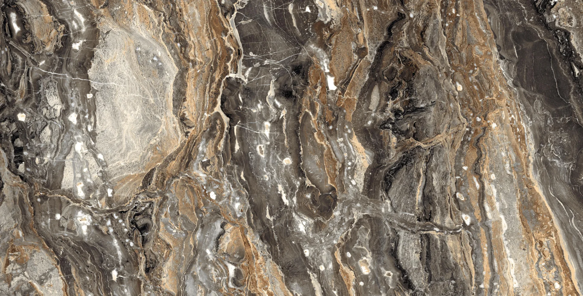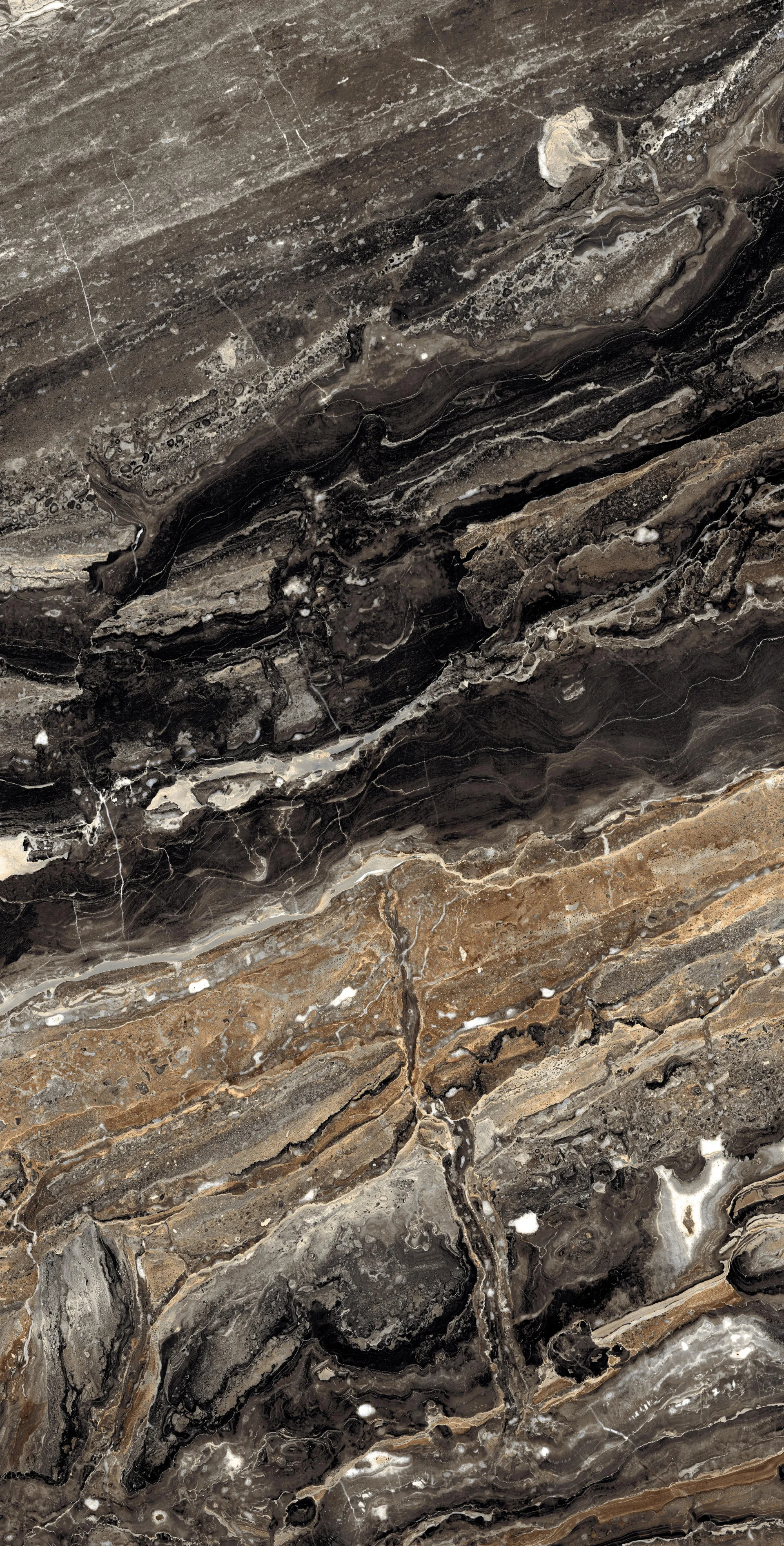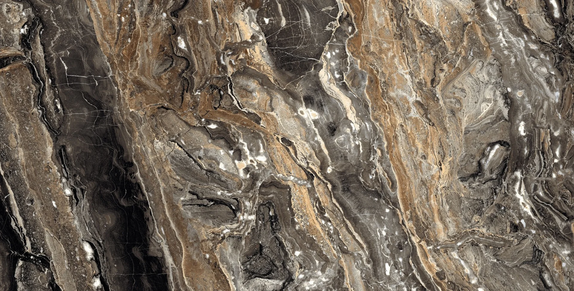 GRESIE DEEPER BROWN - 60X120 cm, porțelanată, aspect de marmura maro intens cu vene aurii și crem, finisaj super lucios (high glossy), recomandată pentru interioare rafinate.