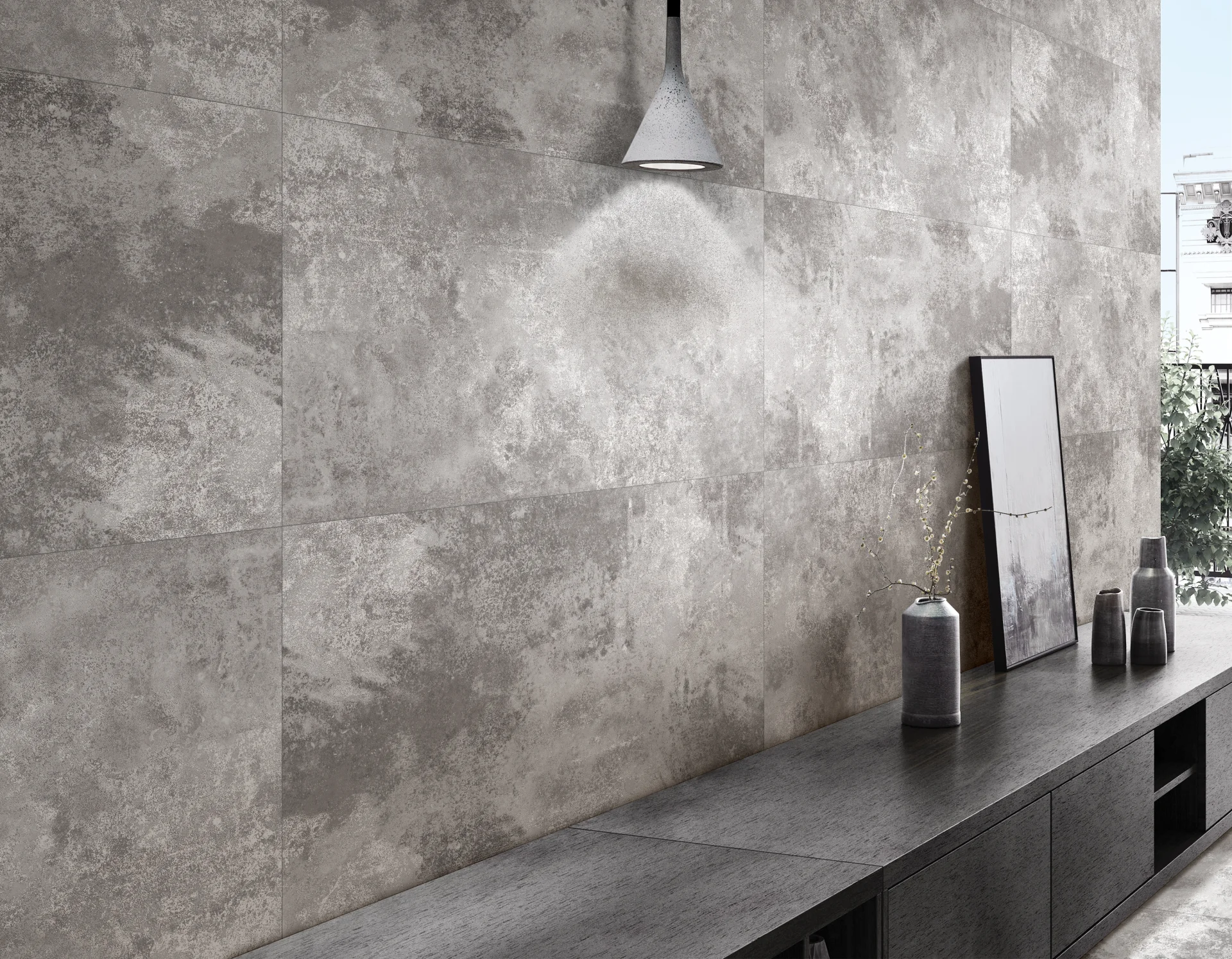 GRESIE MILKYWAY SILVER GRANDE se remarcă printr-un efect metalizat subtil, ce combină nuanțe de gri-argintiu cu accente lucioase ce imită reflexiile industriale.