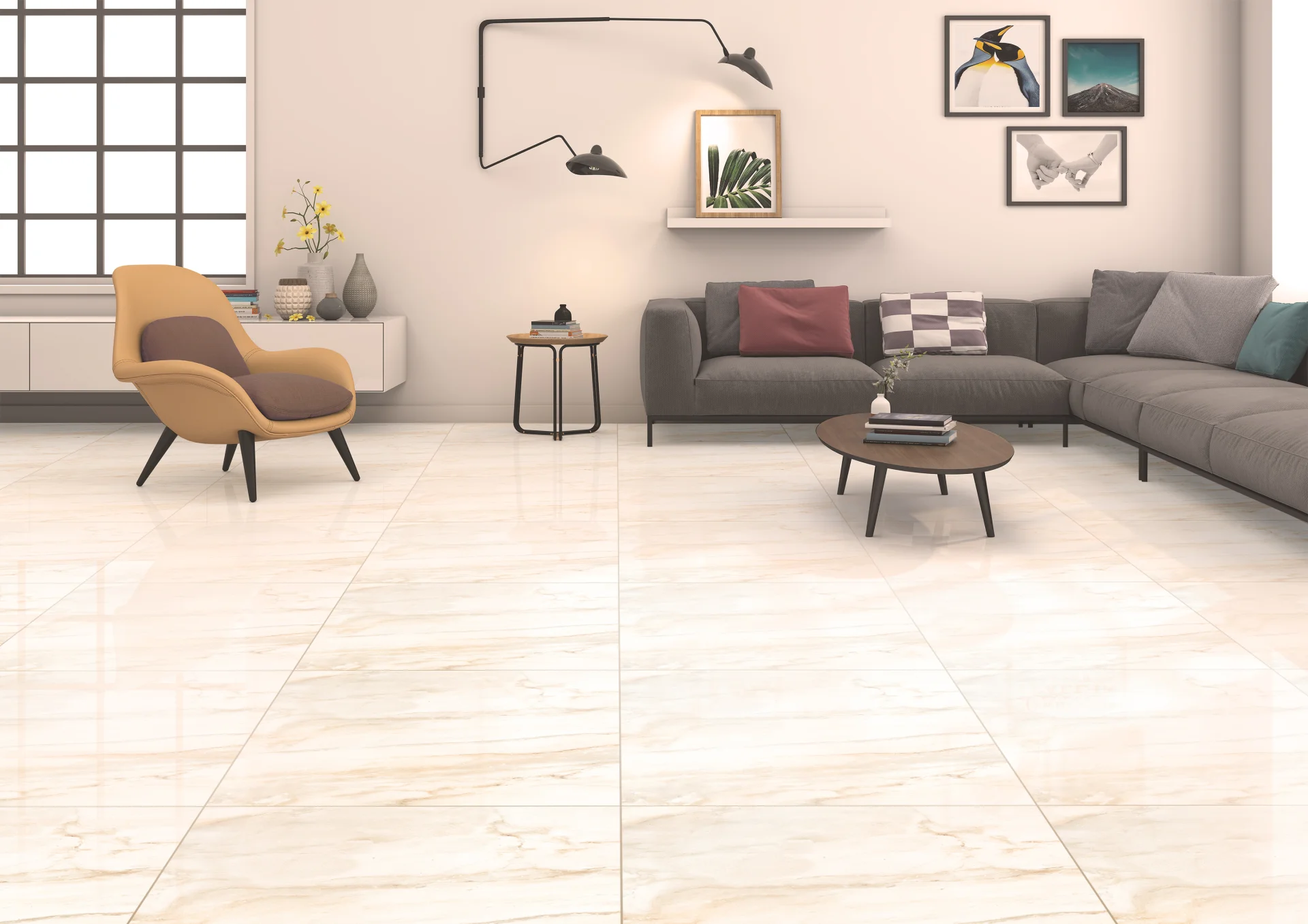 GRESIE AMRON GOLD - 60X60 cm, porțelanată, lucioasă, aspect de marmura naturala în nuanțe calde de crem și auriu deschis, cu vene delicate, ideală pentru interioare elegante și luminoase.