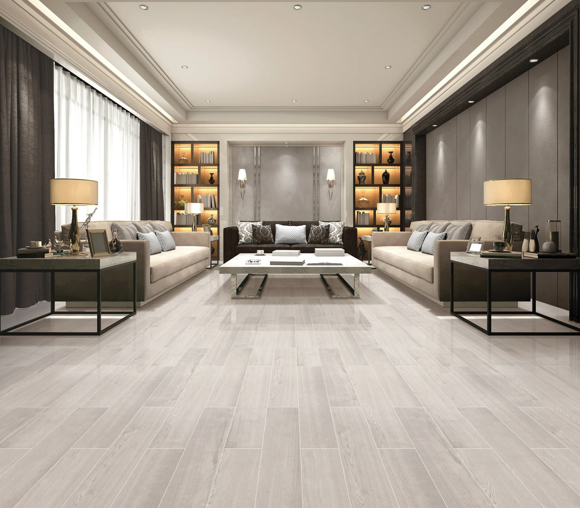 GRESIE PP-1002 - 19.5X120 cm, porțelanată tip parchet, în nuanțe de gri deschis, cu aspect natural de lemn lucios, ideală pentru interioare moderne.