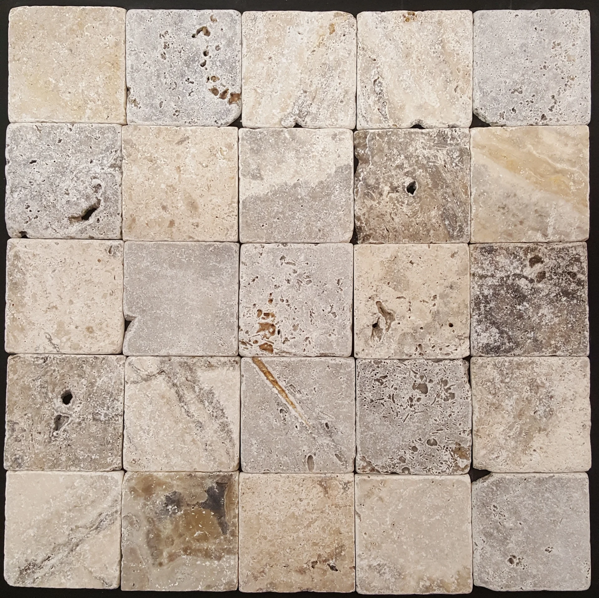 TRAVERTIN SILVER - 10X10 cm, cu finisaj antichizat tumbled, in nuanțe elegante de gri, crem și bej, perfect pentru proiecte cu stil rustic sau contemporan.