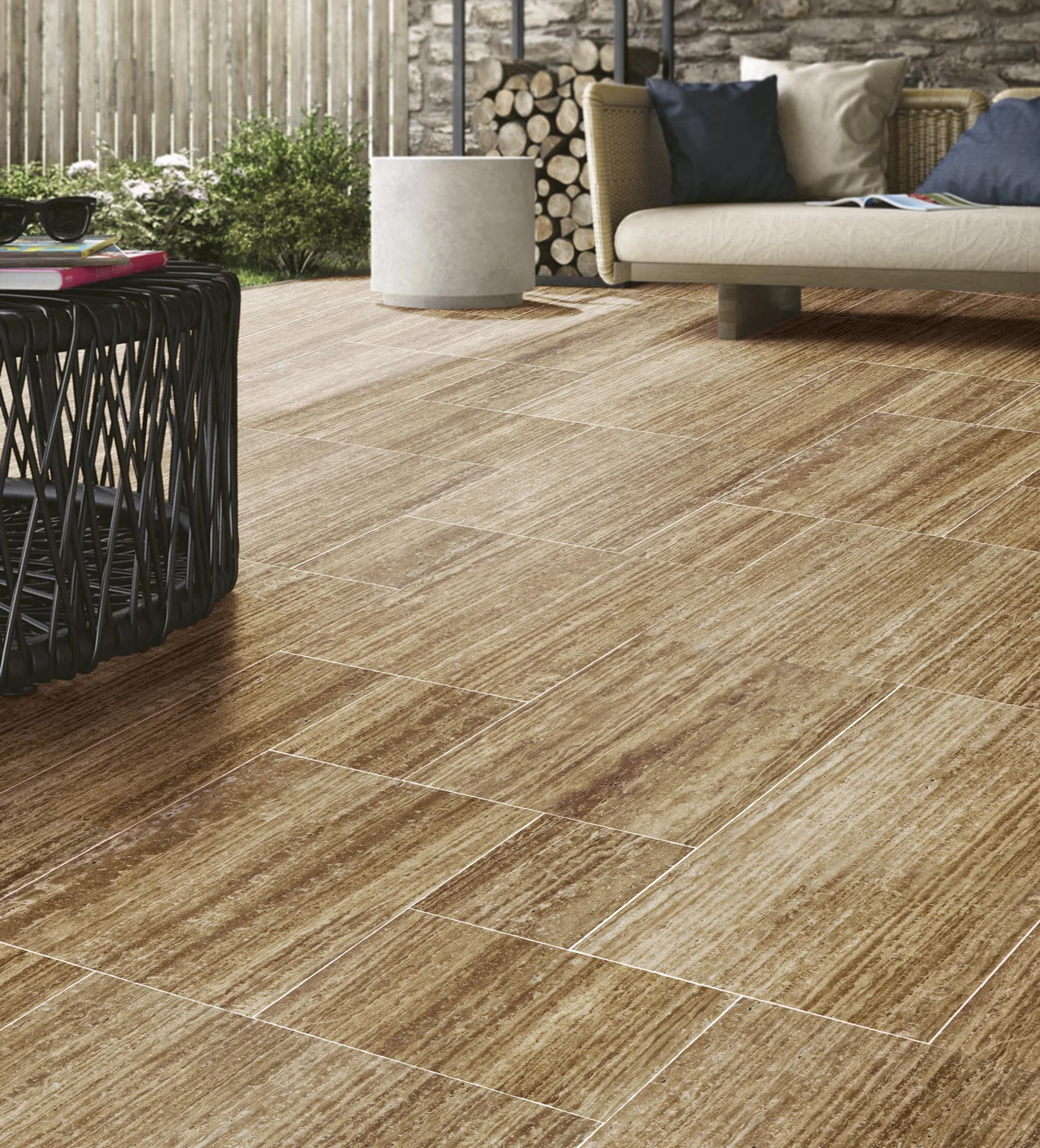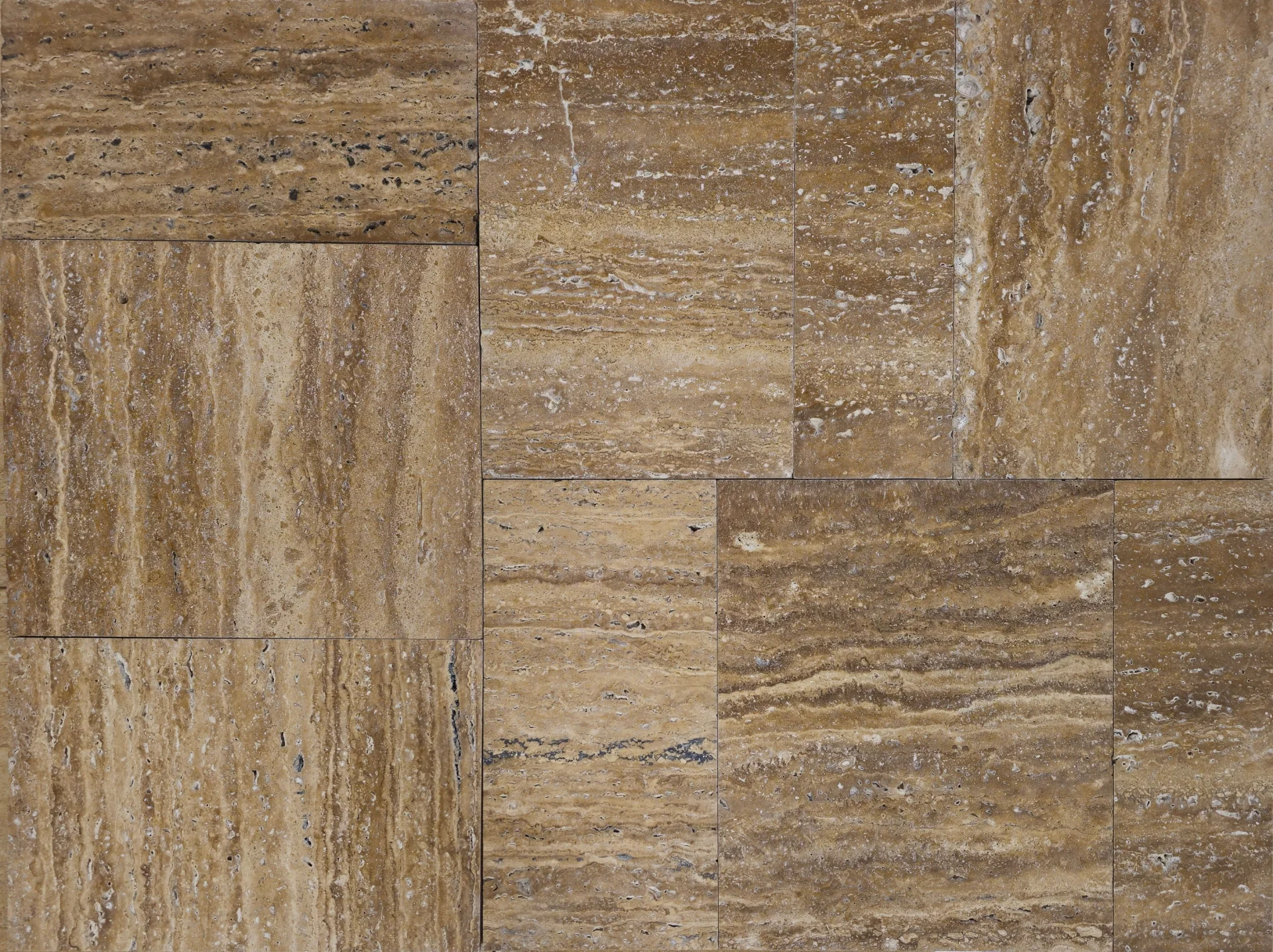 Travertinul este nechituit, astfel porii și imperfecțiunile naturale contribuie la un look autentic, iar tăietura veincut scoate în evidență venele orizontale spectaculoase ale pietrei.