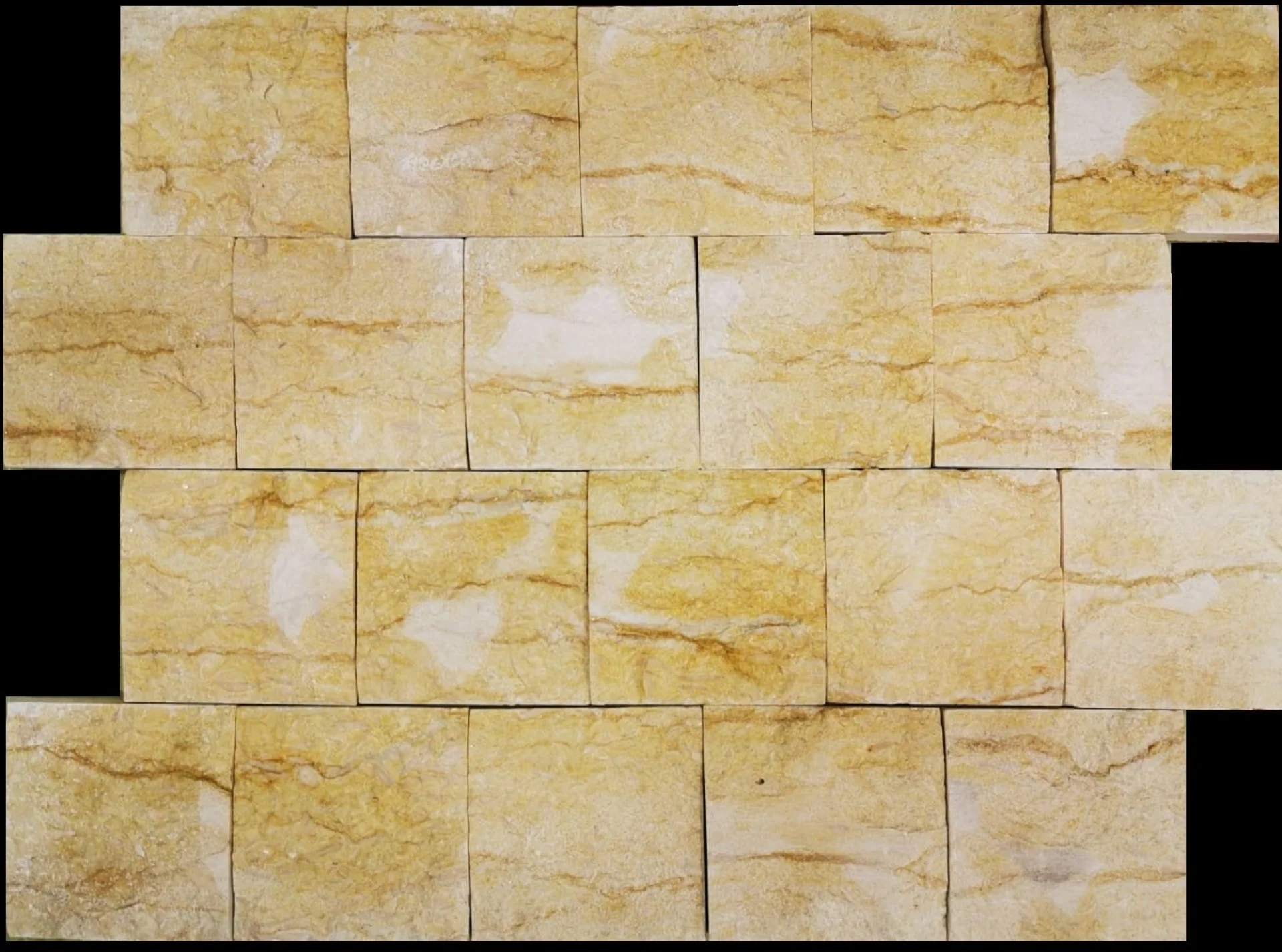 PIATRA SCAPITATA TRAVIN - 10X10 cm, cu tonuri calde de galben, auriu și crem, ideal pentru decor interior și exterior cu accente rustice sau mediteraneene.