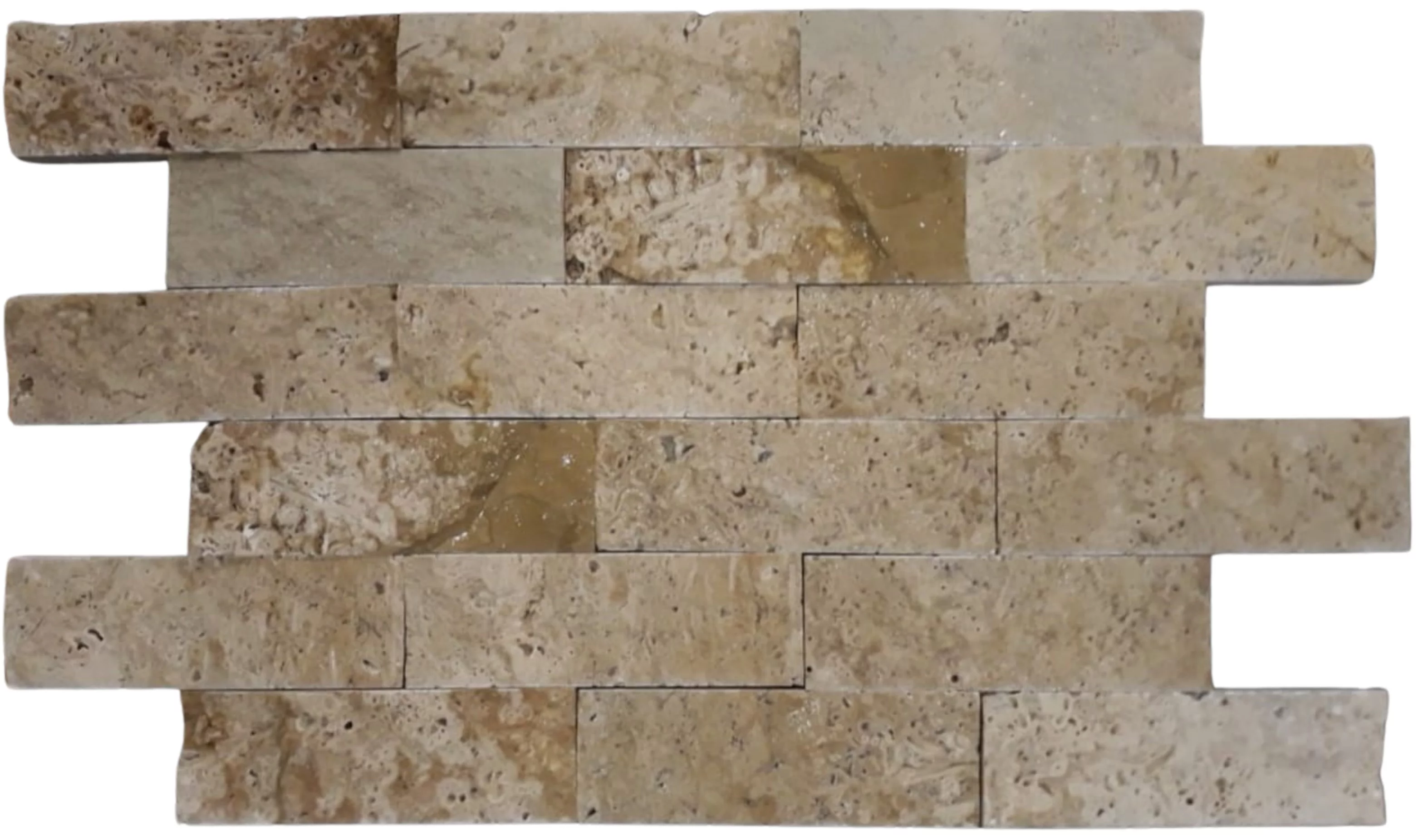 TRAVERTIN RUSTIC - 5X15 cm, grosime variabilă 1.5-1.8 cm, ideal pentru placări decorative interioare și exterioare cu aspect natural, brut și autentic.