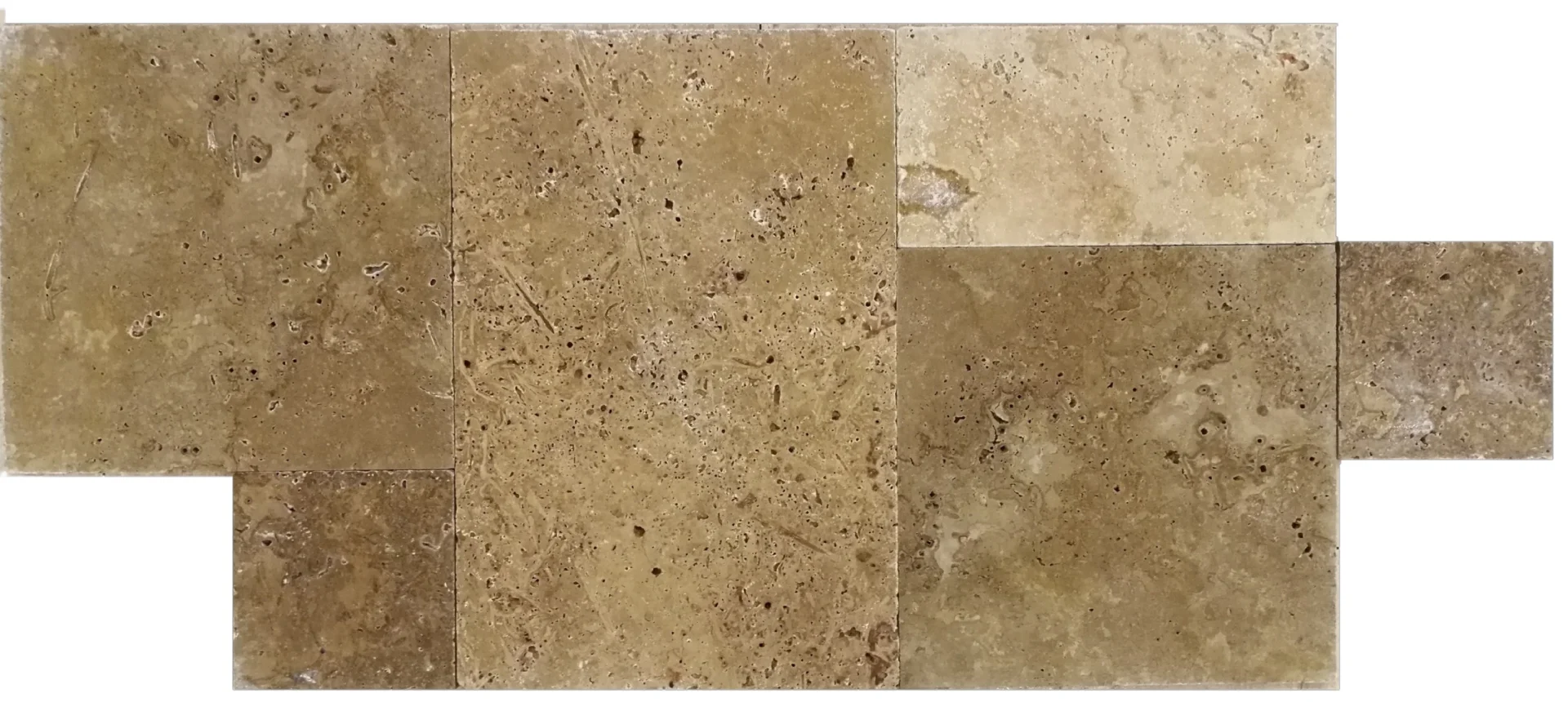 TRAVERTIN NOCHE MIX TUMBLED FP - 1.2 cm, French Pattern, set modular format din 6 plăci de dimensiuni diferite, cu grosime de 1.2 cm, în nuanțe calde de maro și bej, ideal pentru pardoseli naturale cu aspect antichizat, în stil franțuzesc.