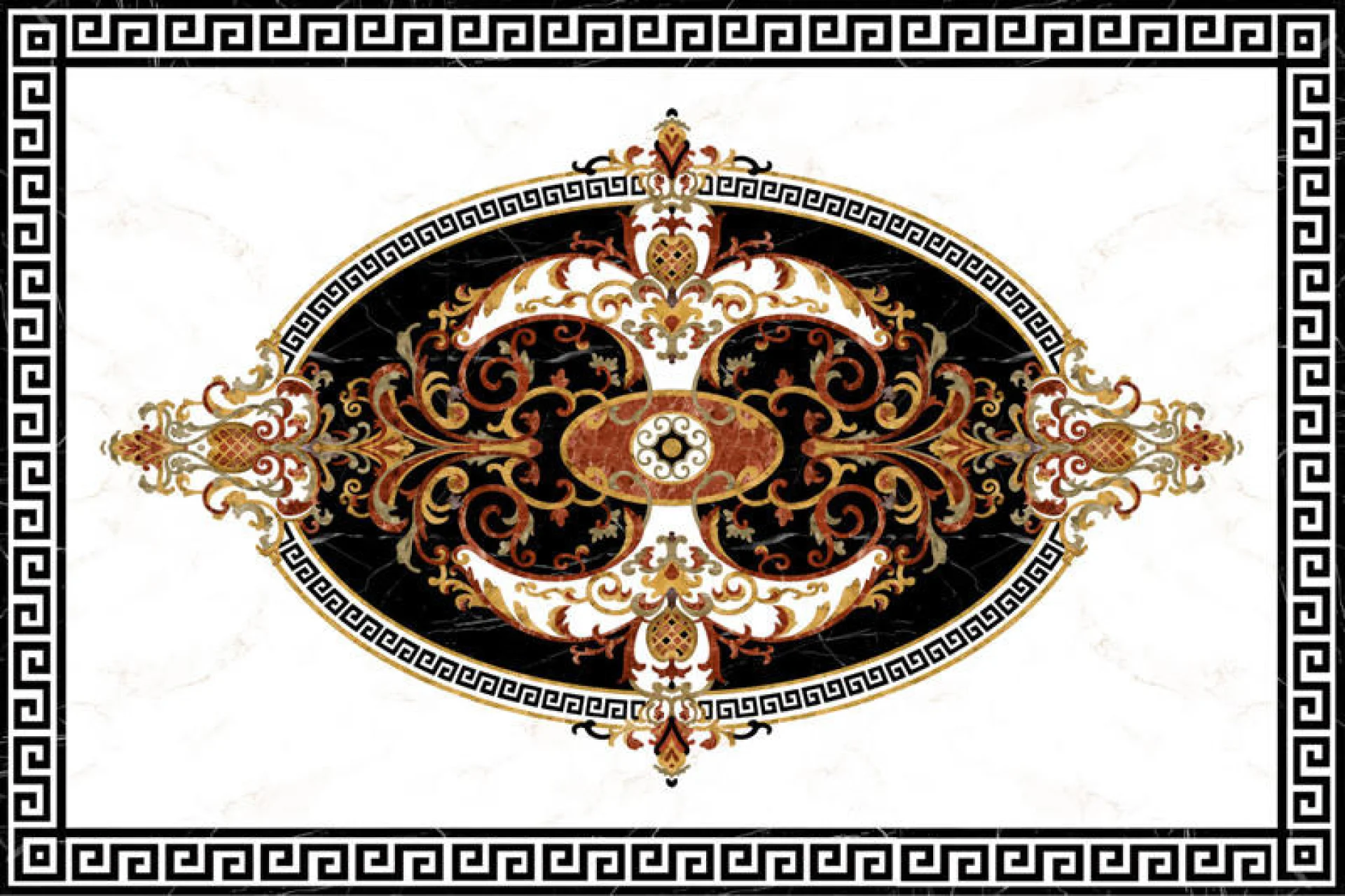 Covorul ceramic FC-10692-G este format din 6 plăci ceramice care, împreună, creează un covor decorativ de dimensiuni 120x180 cm. Modelul baroc, bogat ornamentat, prezintă un medalion oval central în tonuri de negru, alb, auriu și roșu-cărămiziu.