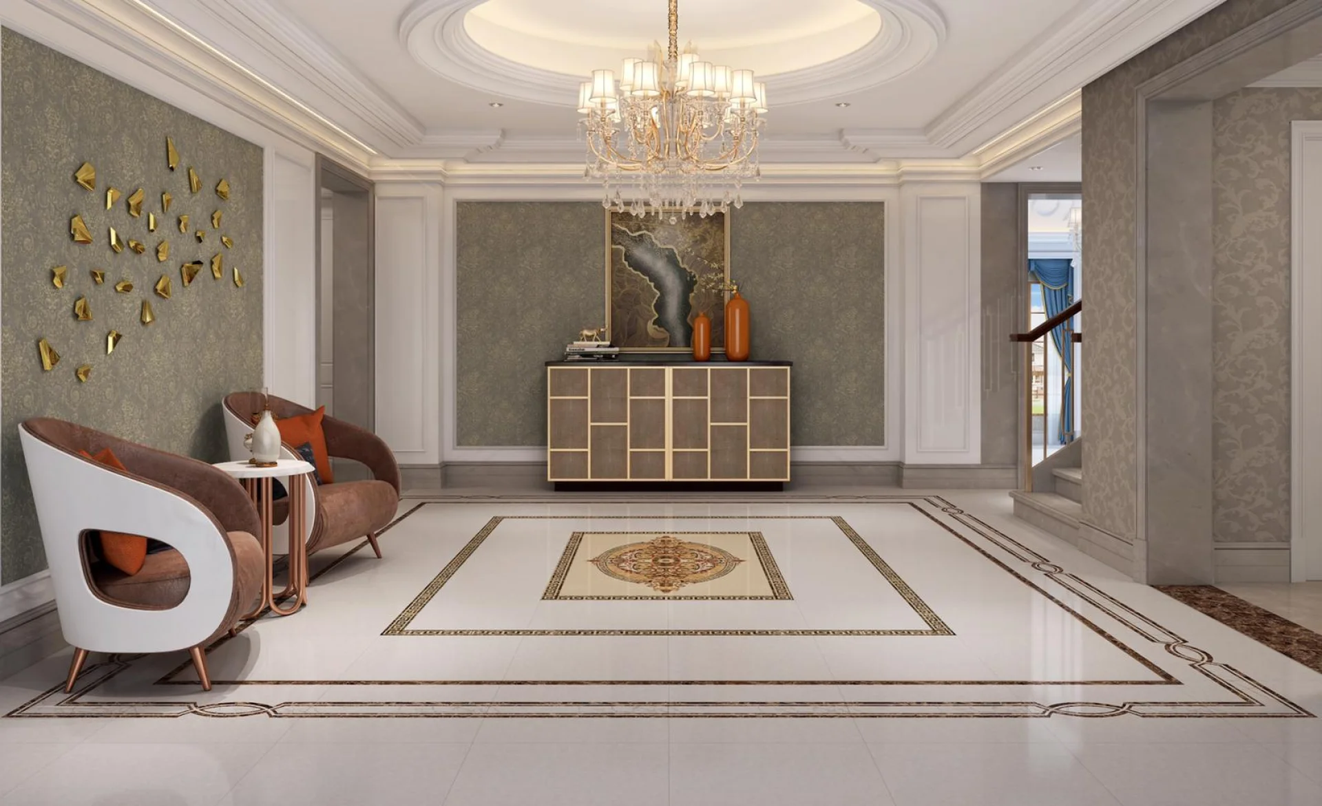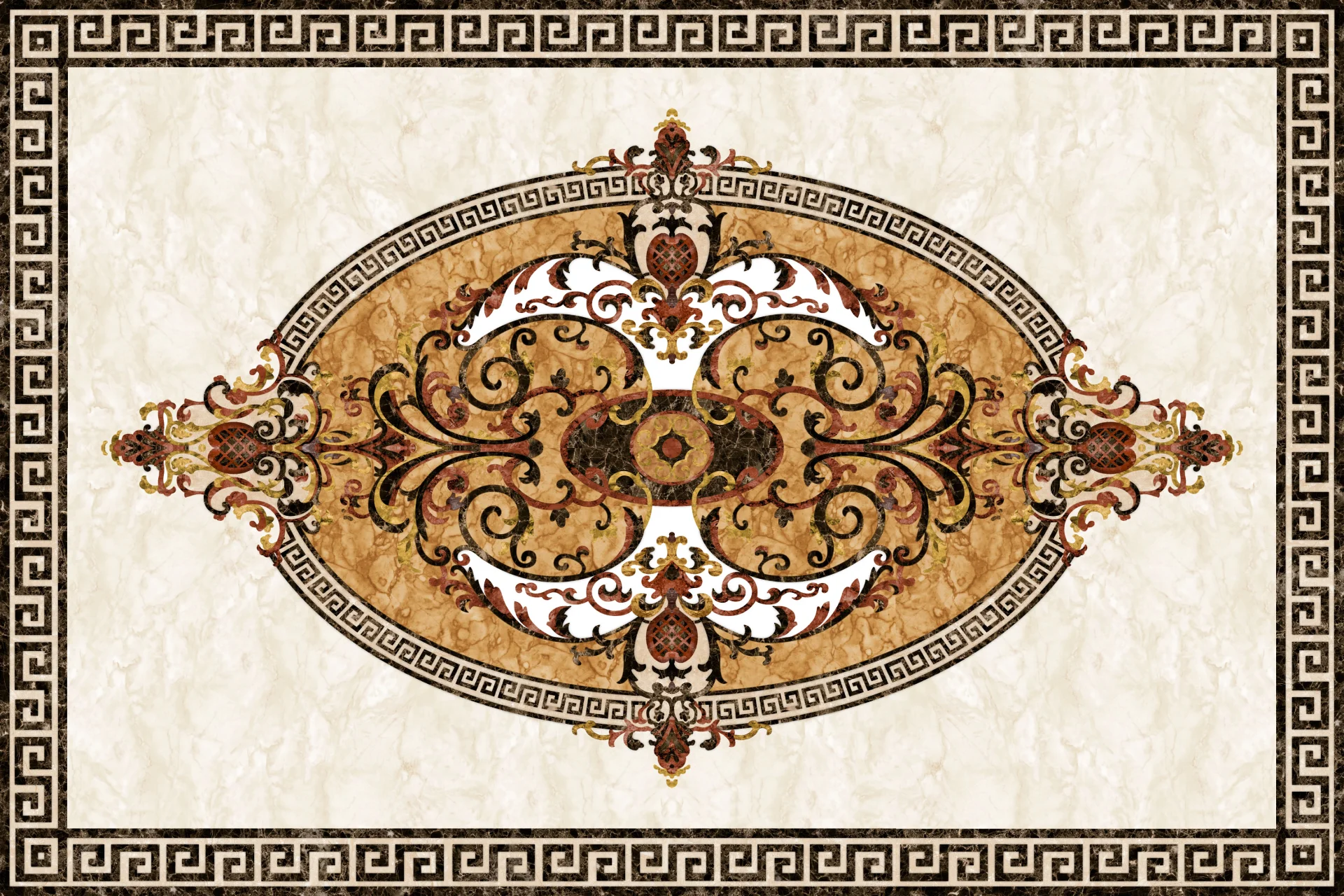 Covorul ceramic FC-8467-G impresionează printr-un design baroc elegant, cu un medalion oval simetric poziționat central.