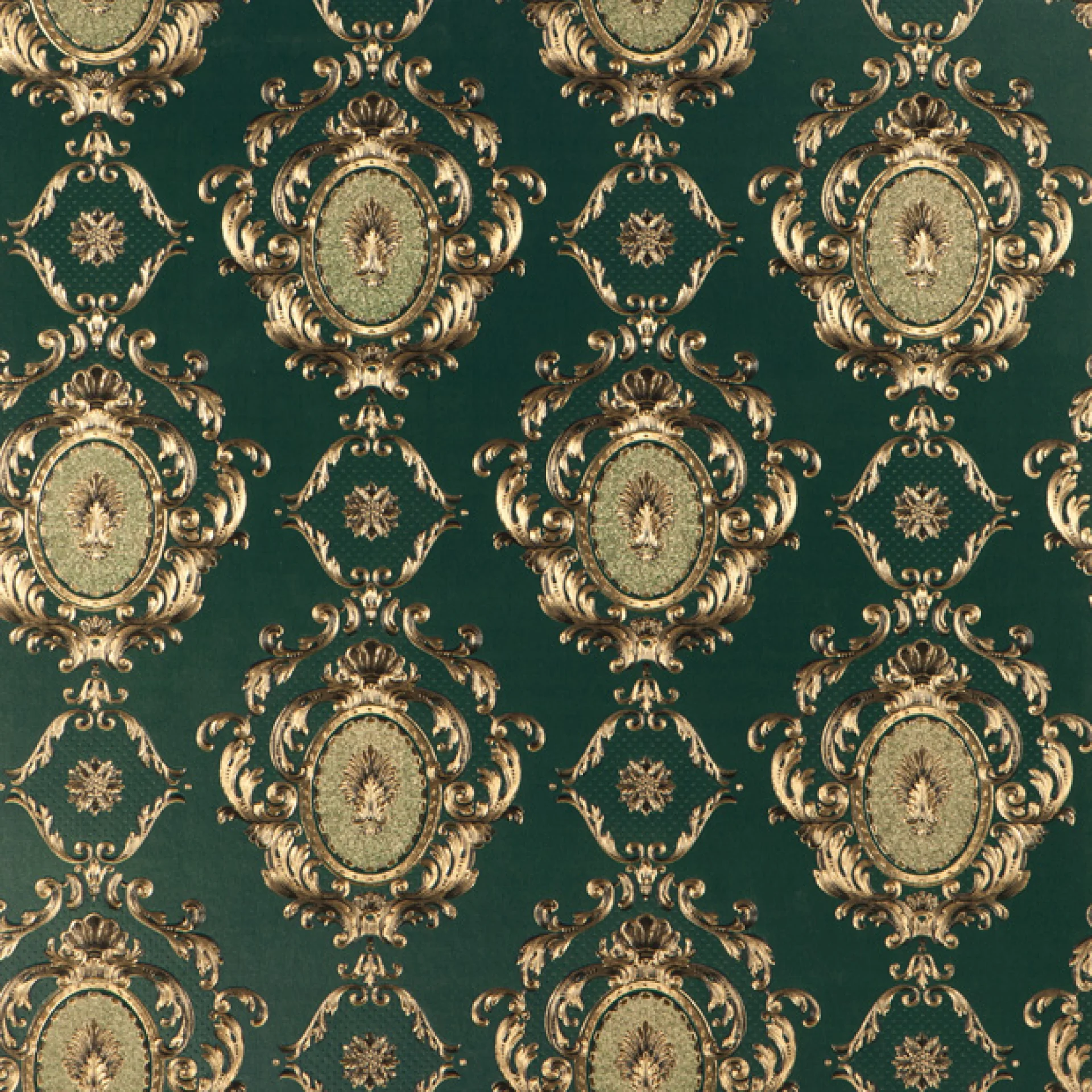 Tapetul GOLD OPULENCE G096707 îmbină rafinamentul baroc cu o cromatică elegantă în verde închis și detalii aurii somptuoase. Medalioanele decorative embosate, inspirate din stilul regal francez, adaugă o notă de fast și distincție, fiind perfect pentru amenajările sofisticate cu accente clasice.