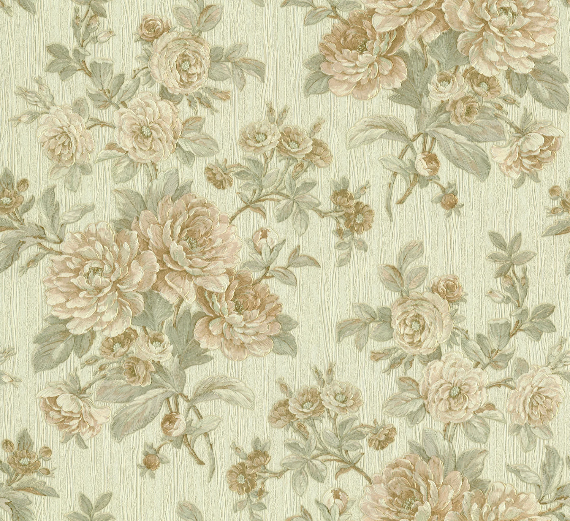 TAPET PVC VICTOR 828505 - 70X1000 cm, are un model floral clasic, cu bujori mari în tonuri de bej, crem și verde pal, pe un fundal texturat subtil. Finisajul satinat-reliefat îi conferă profunzime și rafinament, potrivit pentru interioare elegante, în stil clasic sau vintage.
