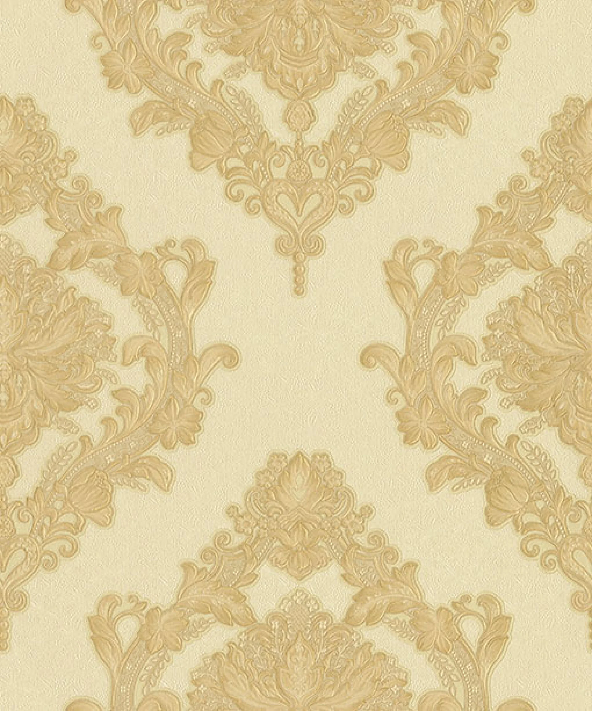 Decorul damasc floral este evidențiat printr-un relief subtil în nuanțe de auriu deschis, pe un fundal crem cald, matasos.