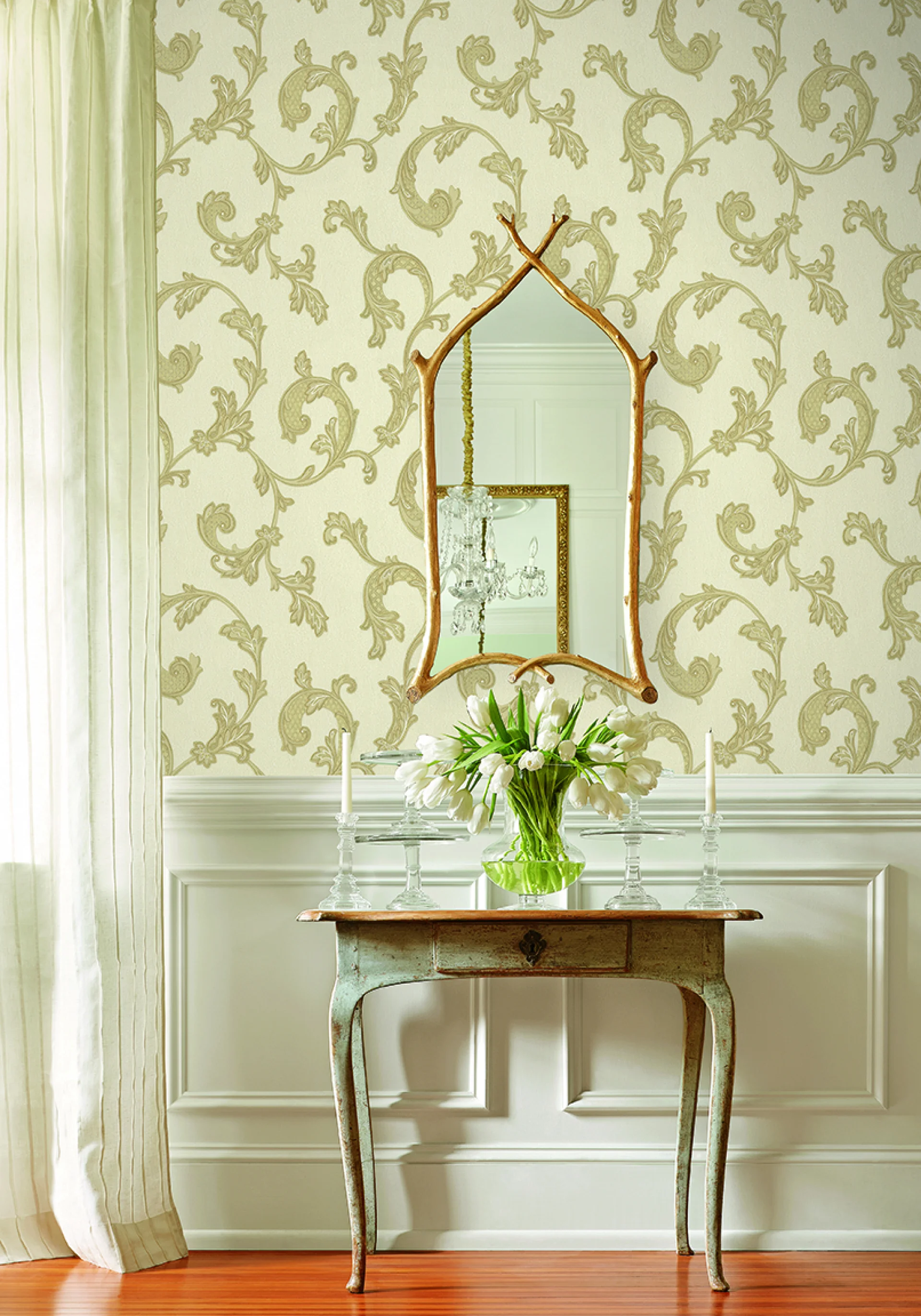 Tapetul GRIES GK 87526 adaugă un plus de eleganță oricărui interior printr-un design vegetal stilizat, în tonuri calde de bej și auriu-oliv.