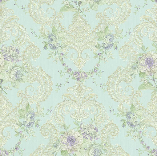 Tapetul MAINZ GK 88343 îmbină un fundal pastelat în tonuri de verde mentă cu un model floral rafinat și arabescuri ornamentale. Florile în nuanțe de mov lavandă, alb și verde pal adaugă o notă romantică și proaspătă, fiind încadrate de detalii baroce ușor embosate, cu accente perlate.