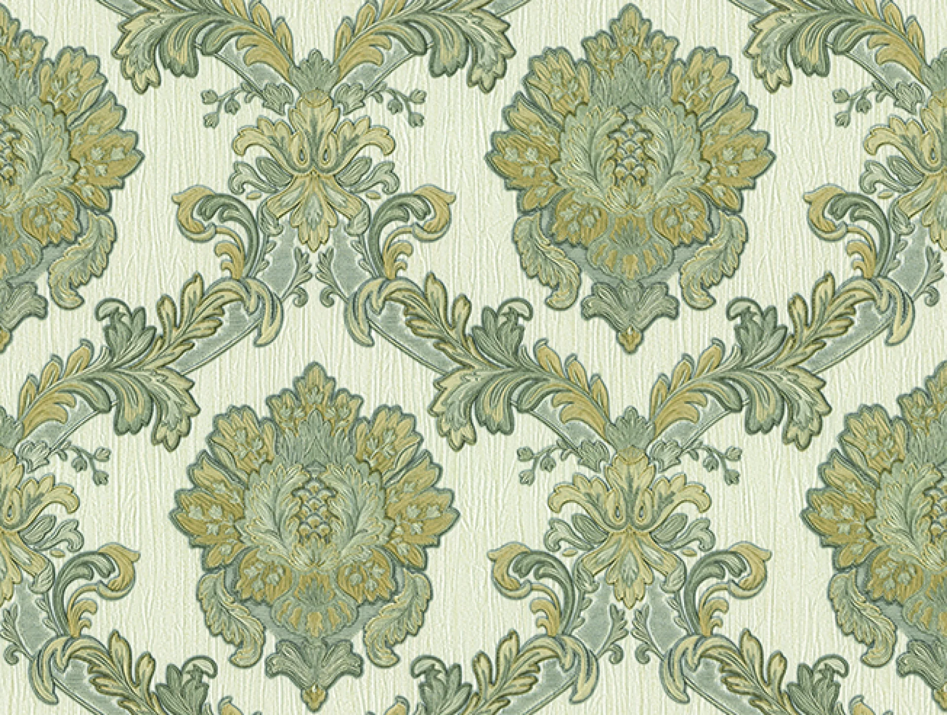 Fundalul crem texturat susține decorul floral simetric, cu frunze și volute, care conferă spațiului o senzație de profunzime și lux discret.