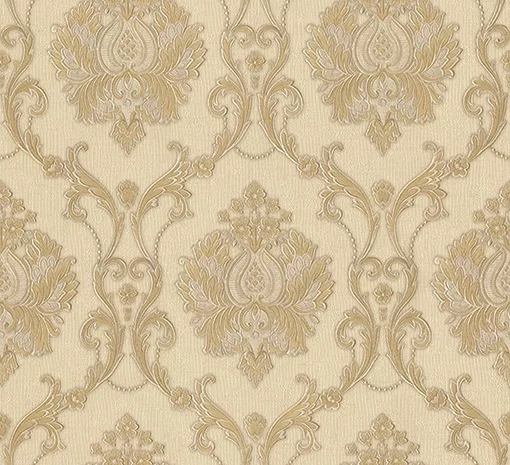 TAPET PVC VELIKA 89305 - 70X1000 cm (7 mp/rolă), cu model baroc rafinat în nuanțe de bej și auriu cald. O alegere elegantă pentru interioare clasice, care adaugă textură, luminozitate și noblețe spațiului.