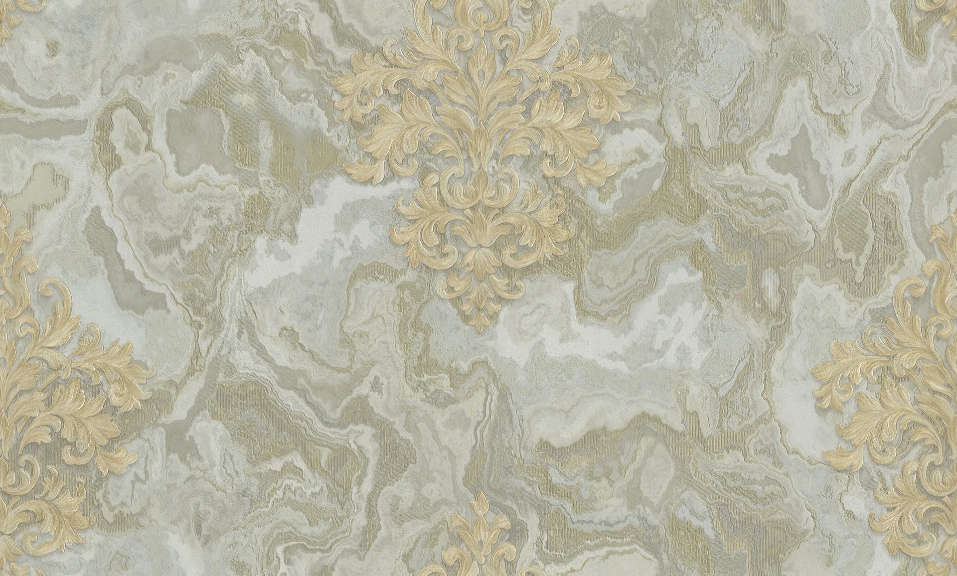 TAPET PVC ROYAL 90940 - 106X1000 cm (10.6 m²/ rolă), PVC, lavabil, model abstract cu fundal marmorat în nuanțe de gri și bej și motiv baroc bej-auriu, ideal pentru interioare sofisticate.