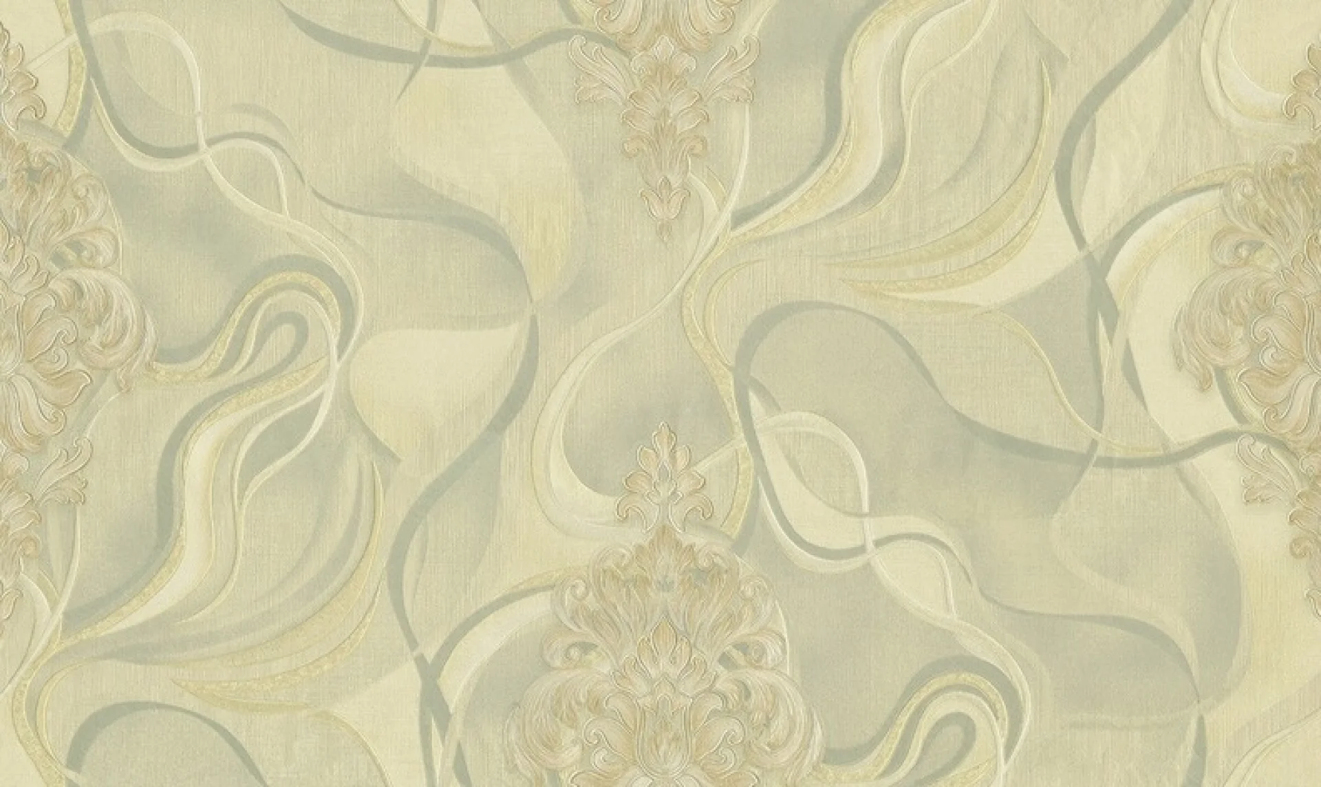 TAPET PVC ROYAL 90919A - 106X1000 cm (10.6 mp/rolă), în nuanțe elegante de bej-auriu și gri deschis, cu model baroc stilizat și linii fluide aurii. Finisaj mat-satinat cu accente sidefate, potrivit pentru decoruri rafinate.