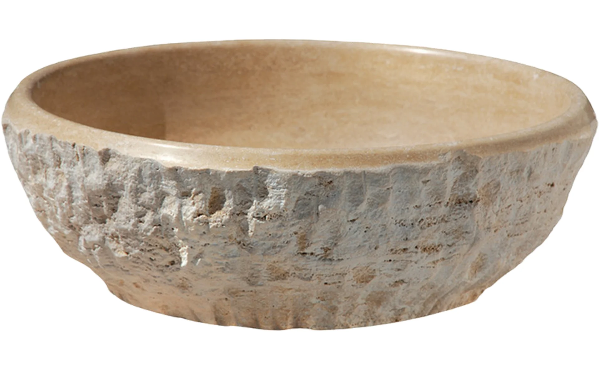 LAVOAR DIN TRAVERTIN LIGHT AC L18 - 42x15 cm, rotund, finisaj exterior cioplit, interior chituit cu praf de travertin, montaj pe blat, culoare bej deschis natural.