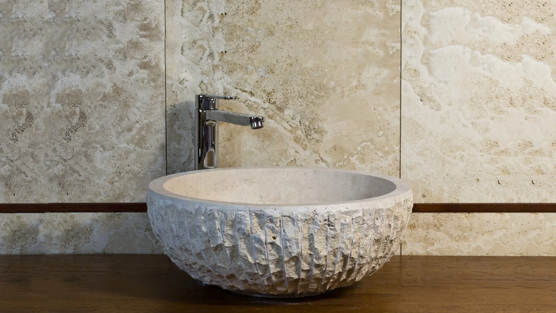 LAVOAR DIN TRAVERTIN LIGHT AC L18 este sculptat manual din travertin natural Light, cu un finisaj cioplit la exterior, păstrând textura brută a pietrei pentru un aspect rustic și autentic.