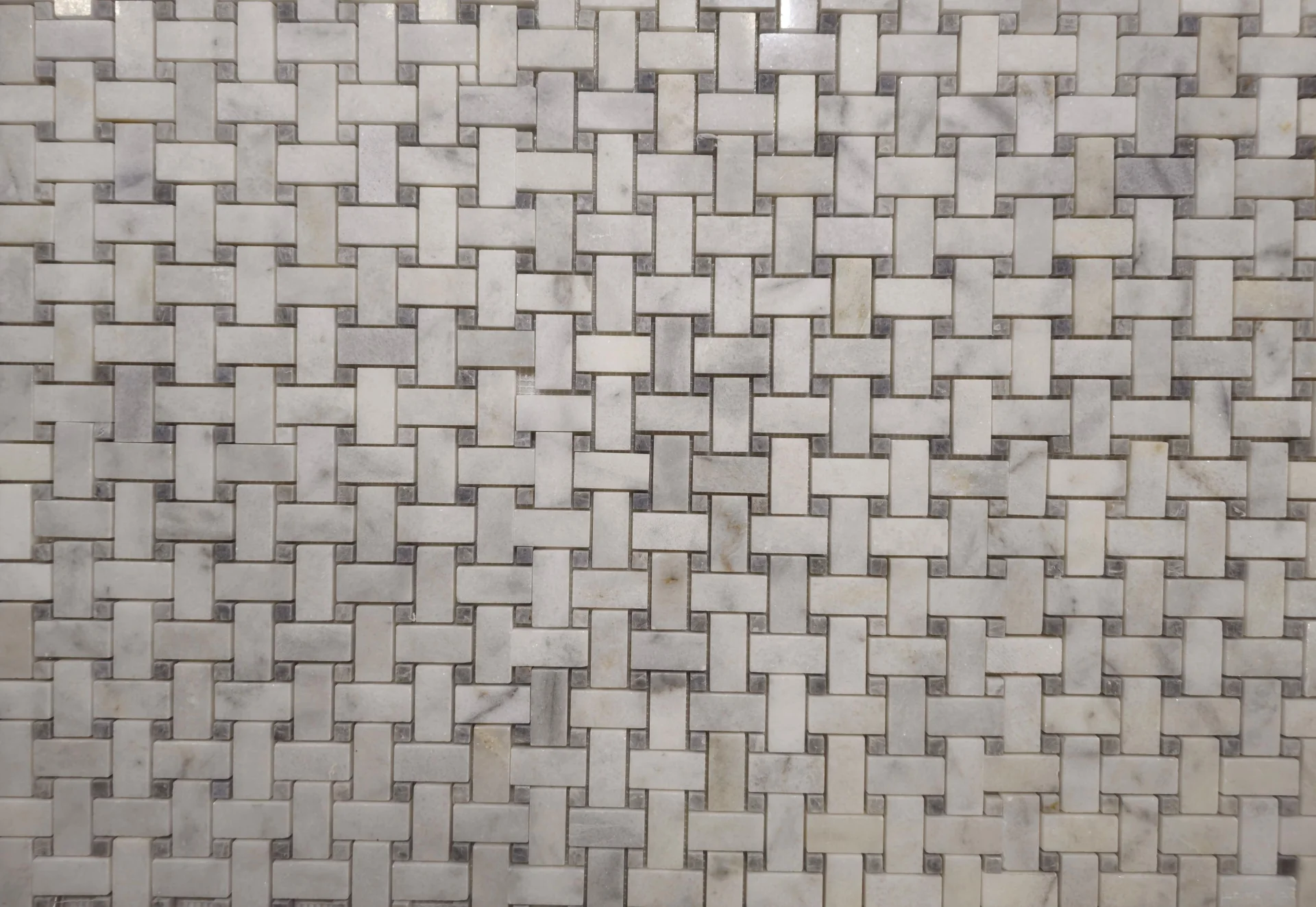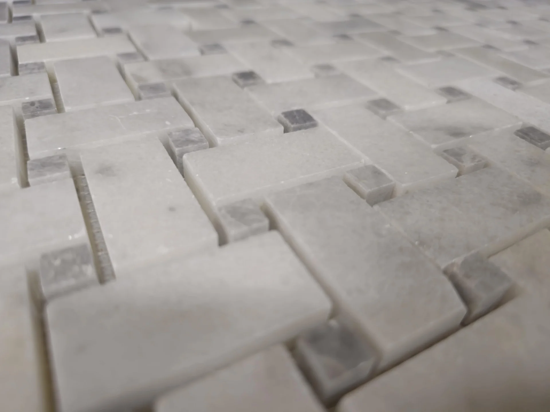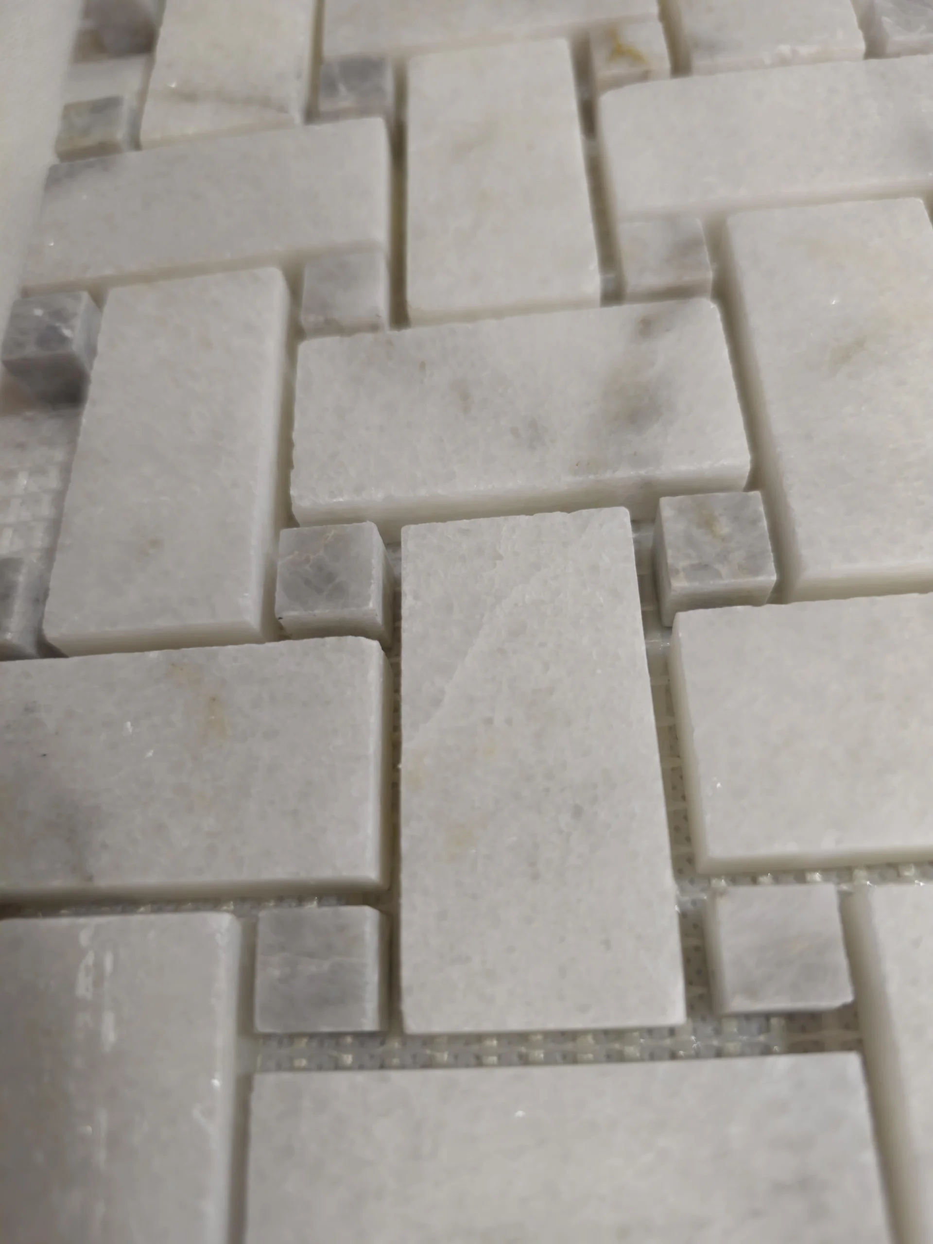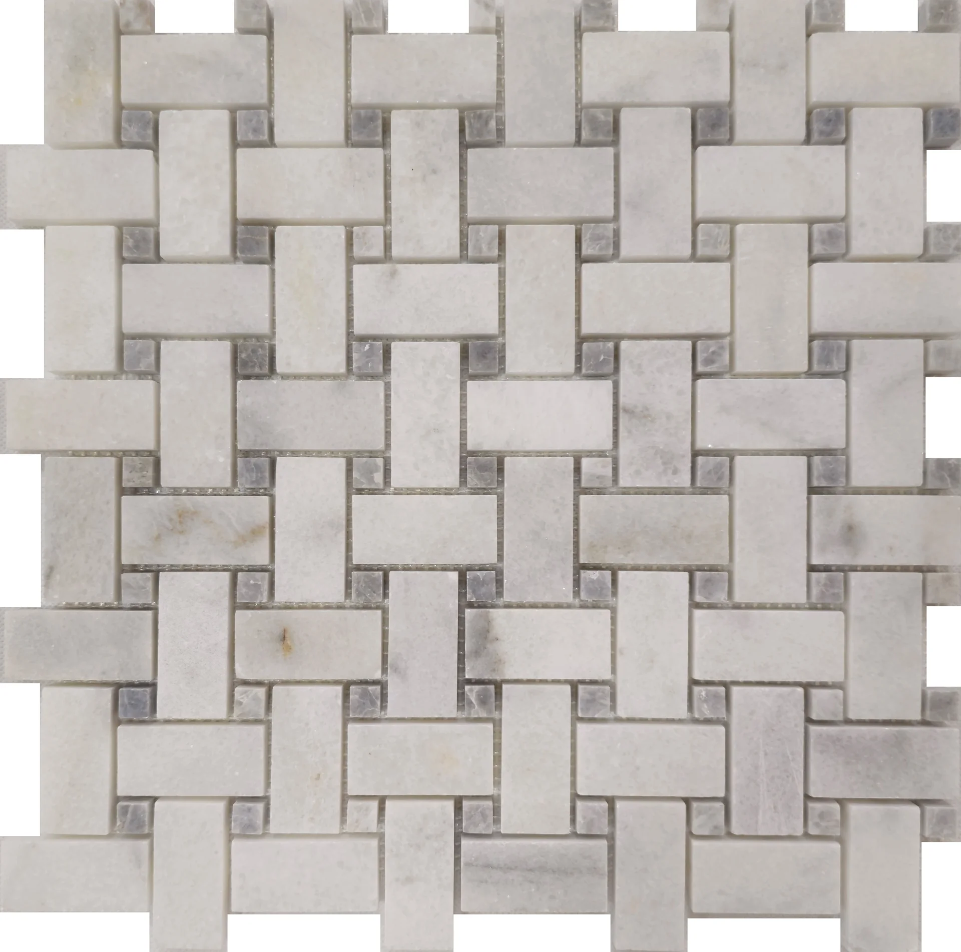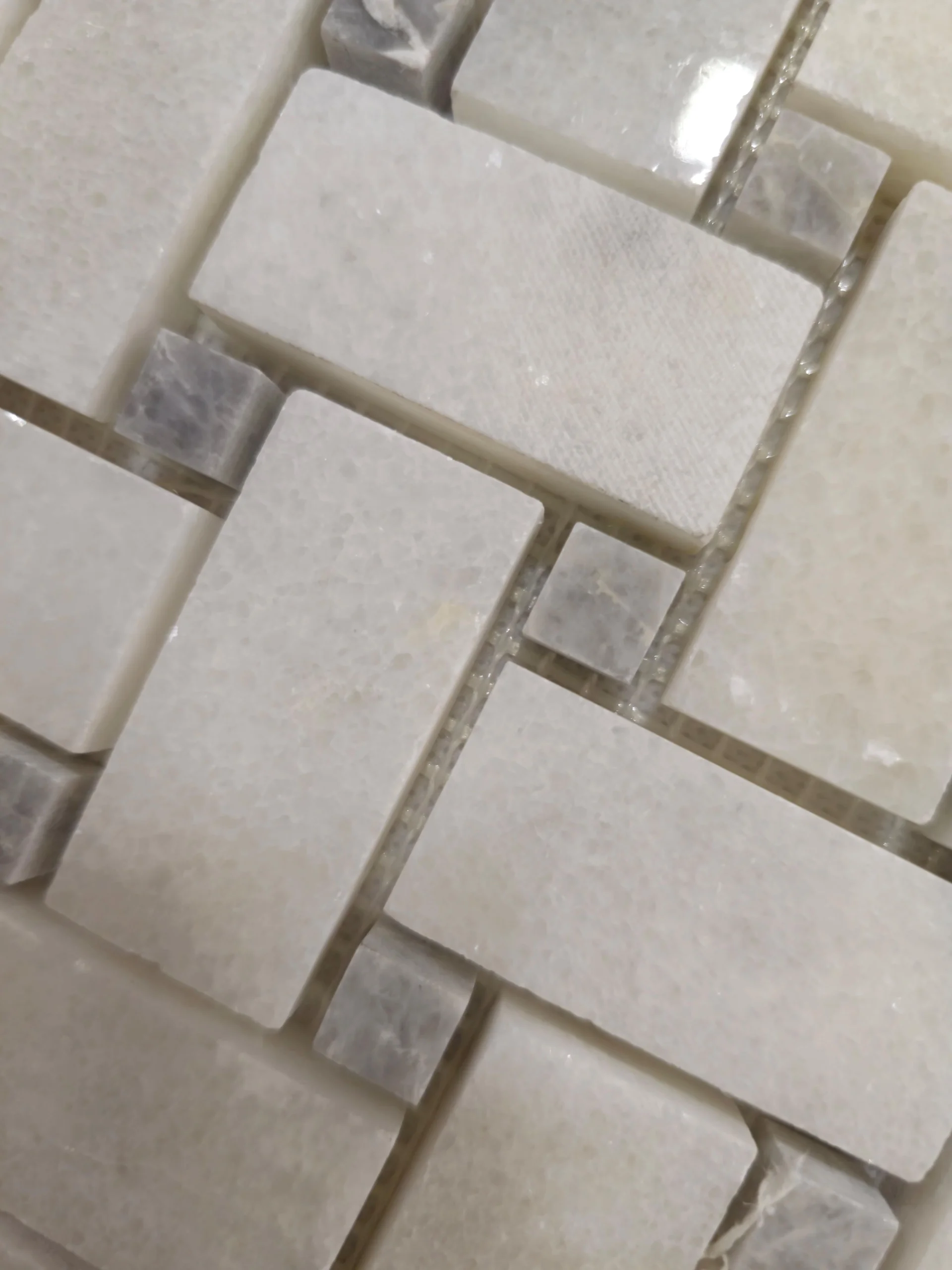 MOZAIC MARMURA MUGLA WHITE BASKETWEAVE este o alegere rafinată pentru amenajările interioare, combinând eleganța marmurei albe cu un model clasic tip împletitură (basketweave).