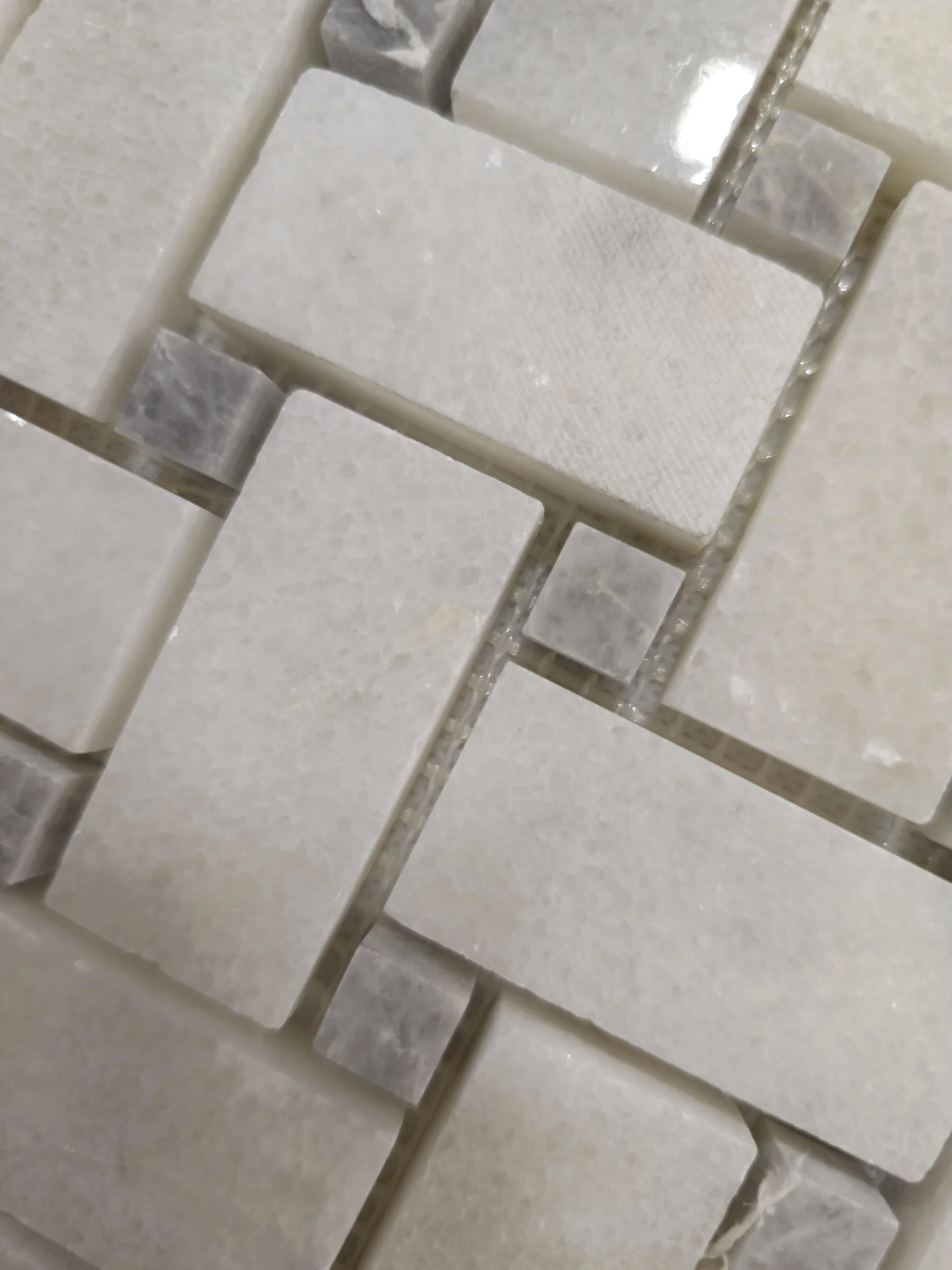 MOZAIC MARMURA MUGLA WHITE BASKETWEAVE - 30.7x30.7 cm, grosime 1 cm, alb cu venaturi discrete gri-bej, variații naturale subtile, finisaj lucios, ideal pentru interioare clasice sau moderne.