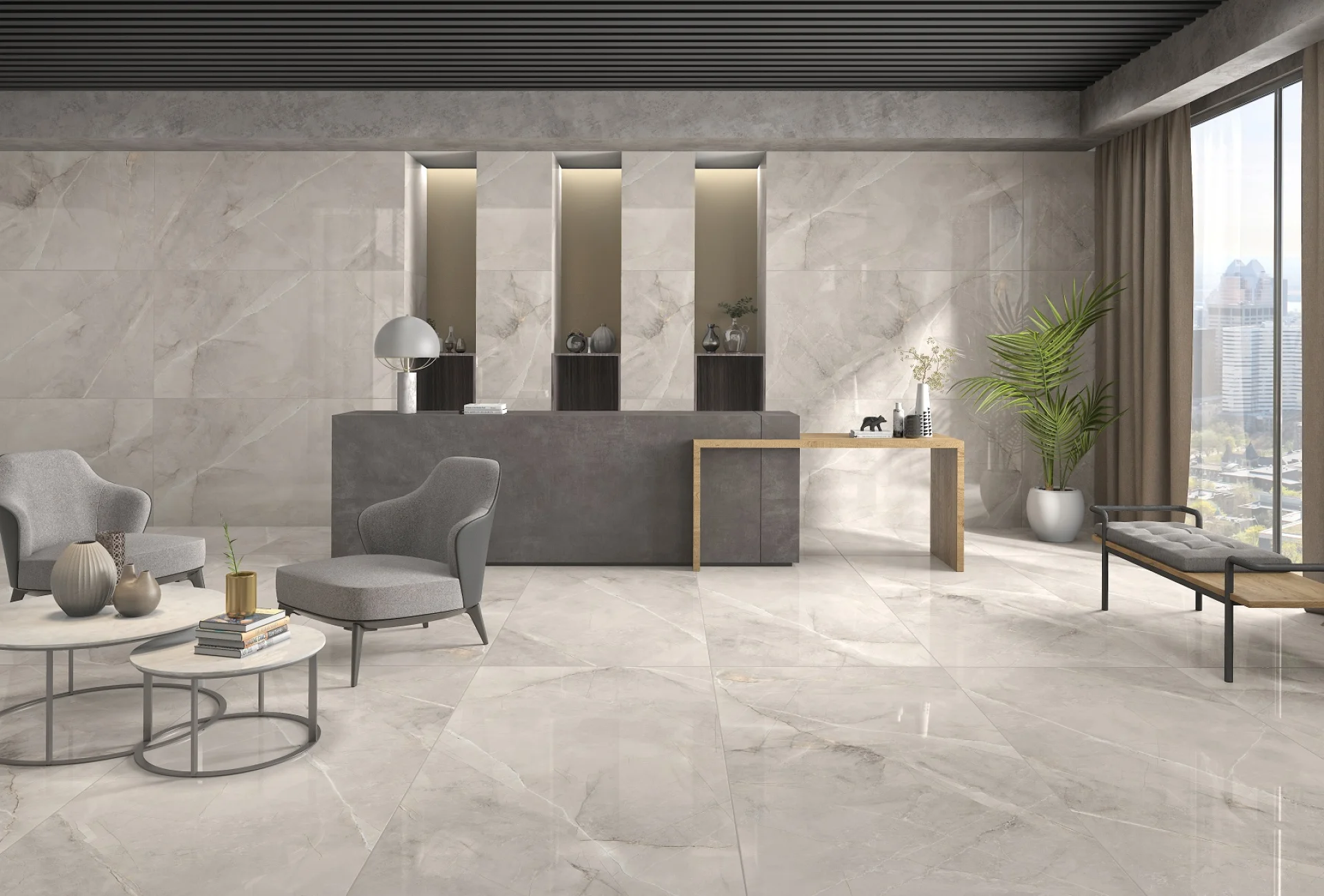 • Culoare și aspect: Gri deschis cu vene naturale fine, aspect marmură lucioasă